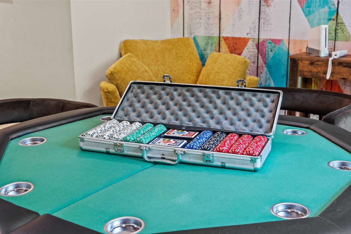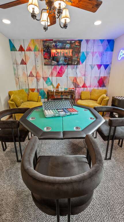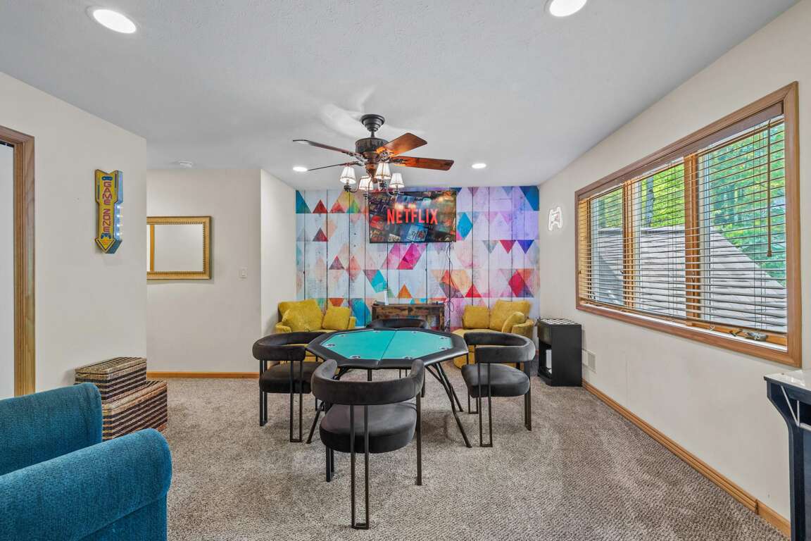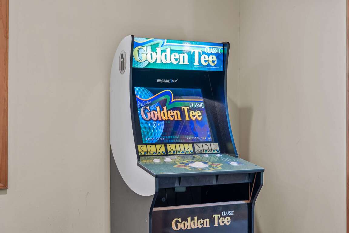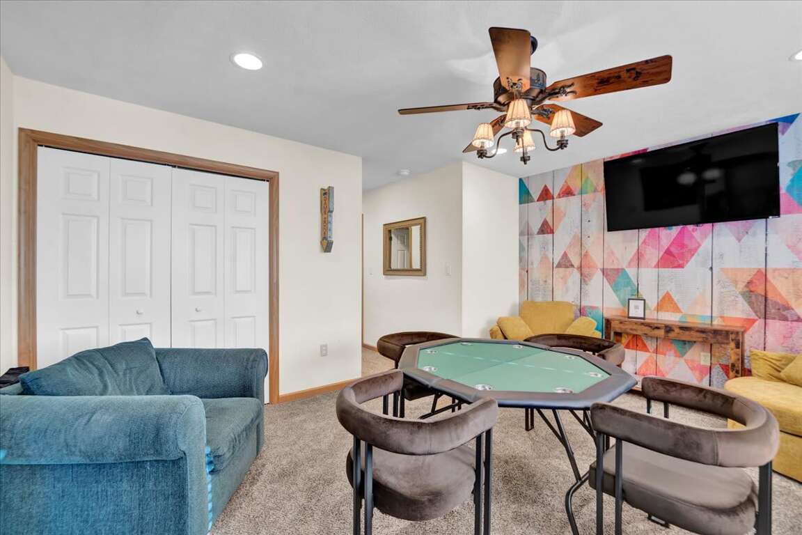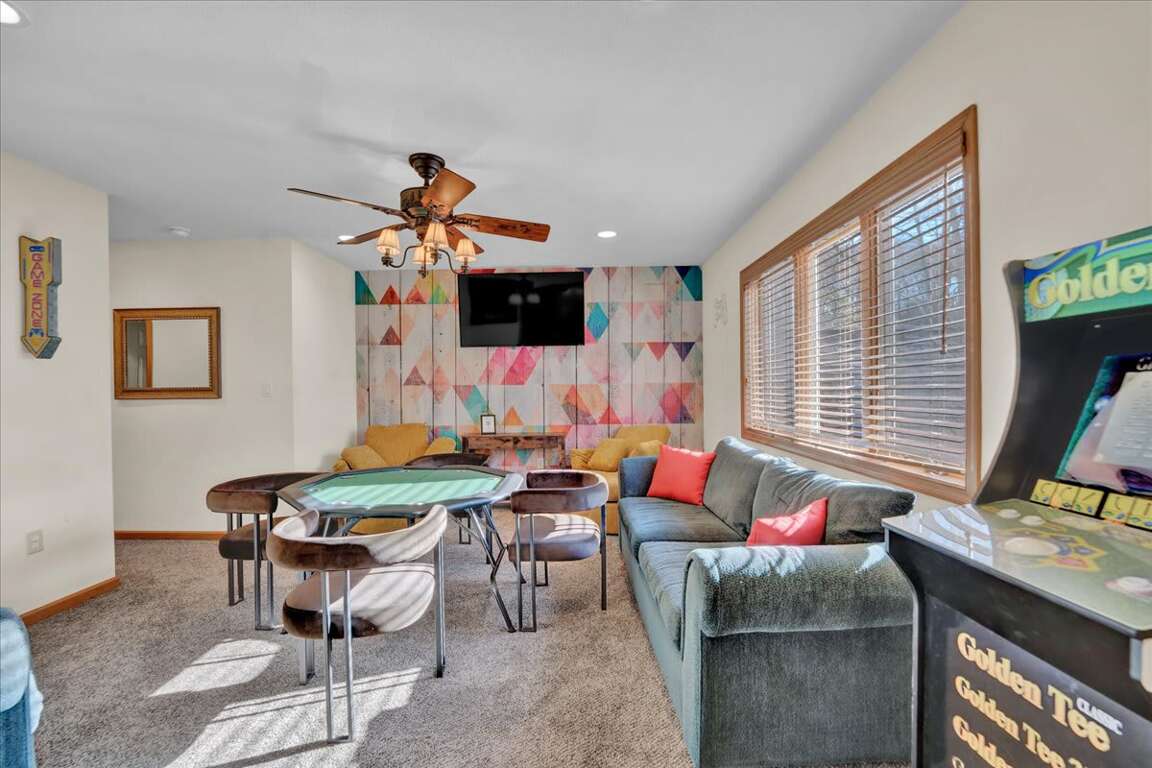 β Game room w/ pool table, poker table, Golden Tee golf arcade machine, chess, & large Connect4