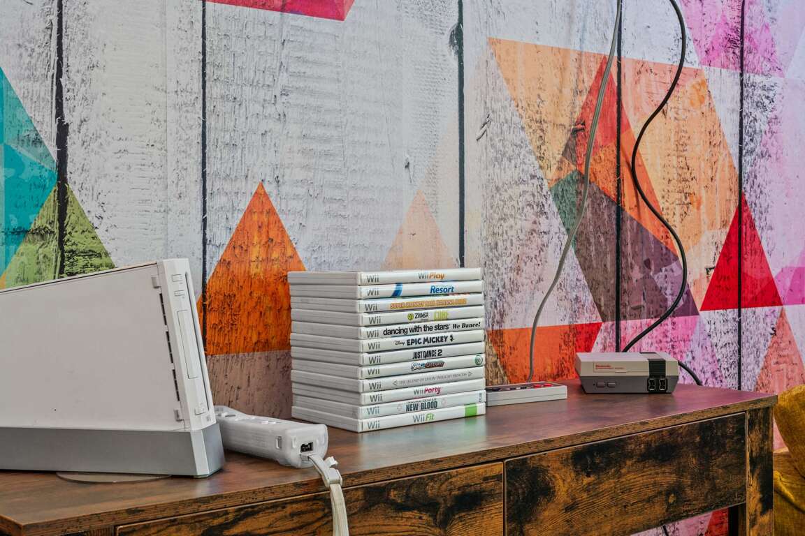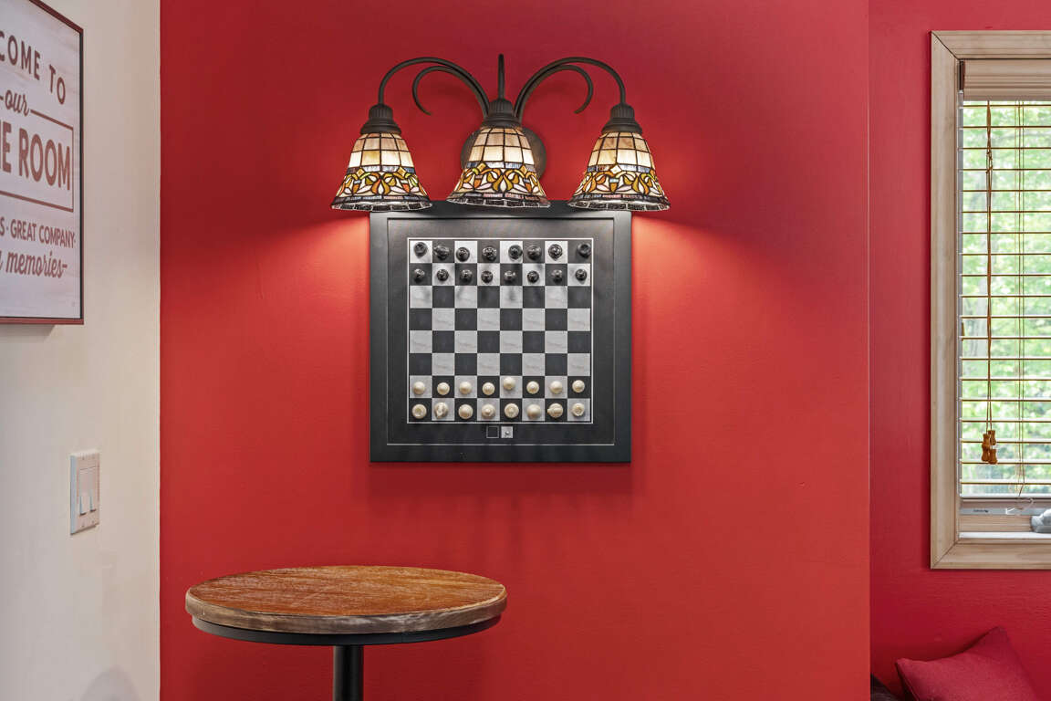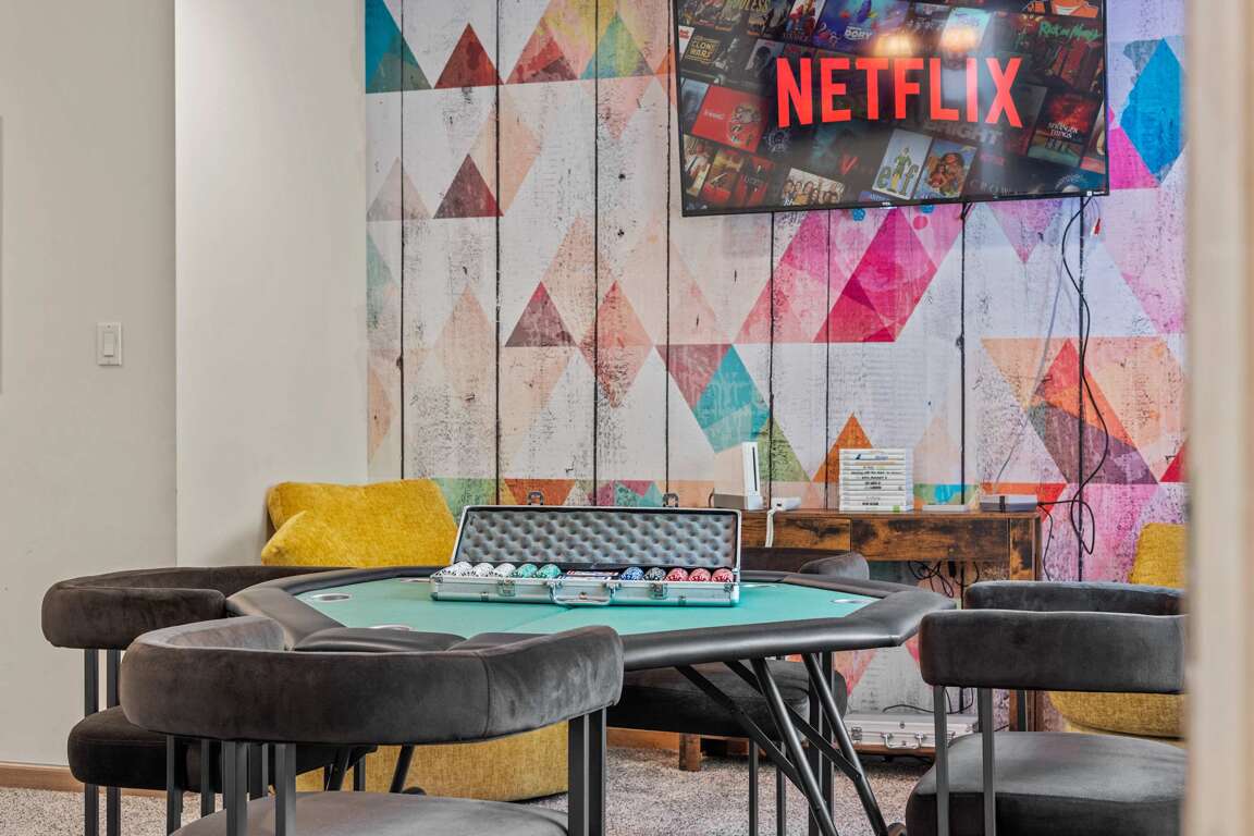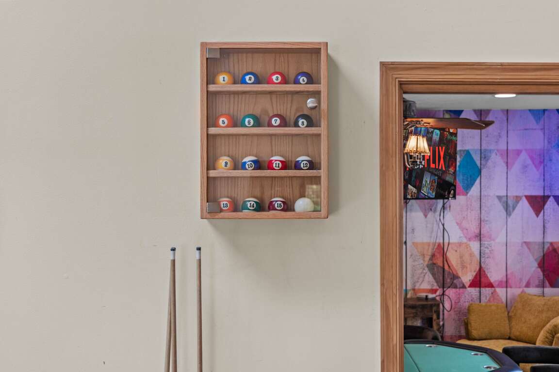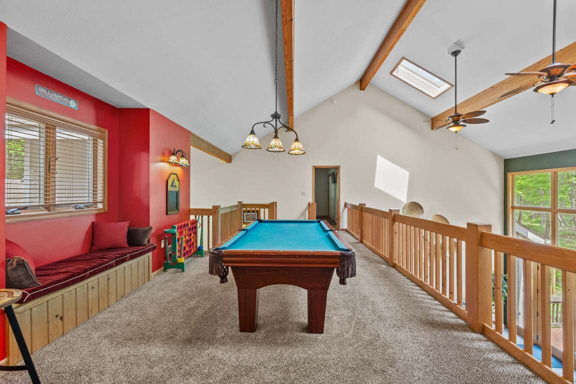 β Game room w/ pool table, poker table, Golden Tee golf arcade machine, chess, & large Connect4