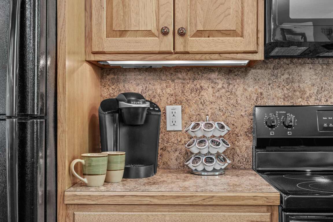 β Keurig machine & coffee pot with complimentary coffee and tea