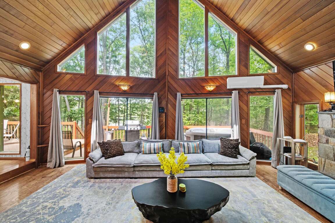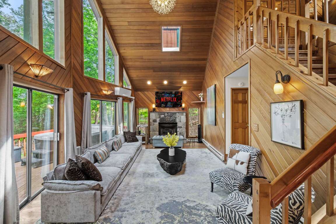Experience comfort at this charming East Stroudsburg vacation cabin, featuring 5 spacious bedrooms, a hot tub, and a sauna for ultimate relaxation: Chalet Eclat