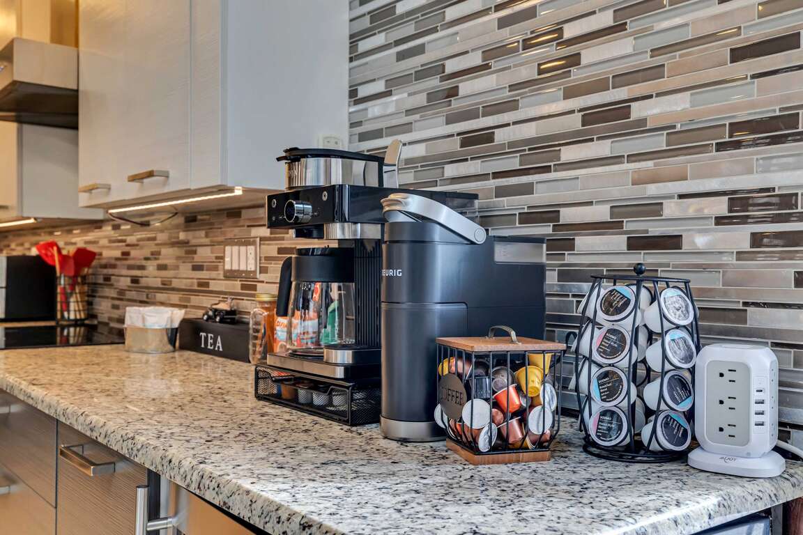 β Complimentary coffee pods & grounds, espresso pods, honey sticks, hot chocolate, and more!