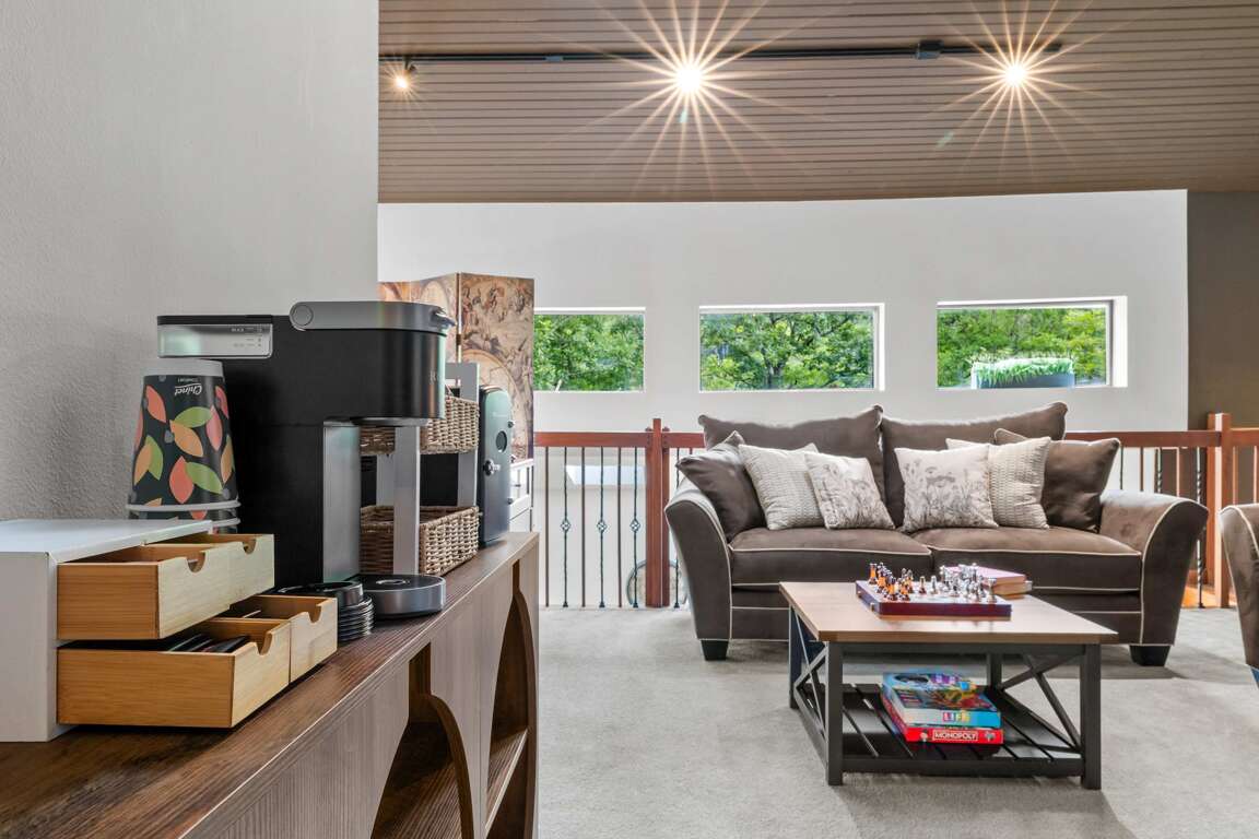 β Coffee station: Drip, single cup & espresso machines w/ pods & grounds provided
