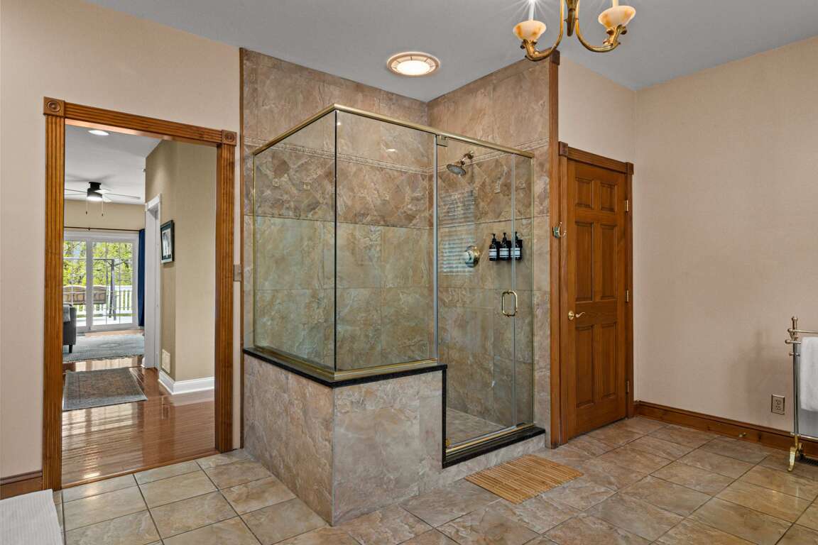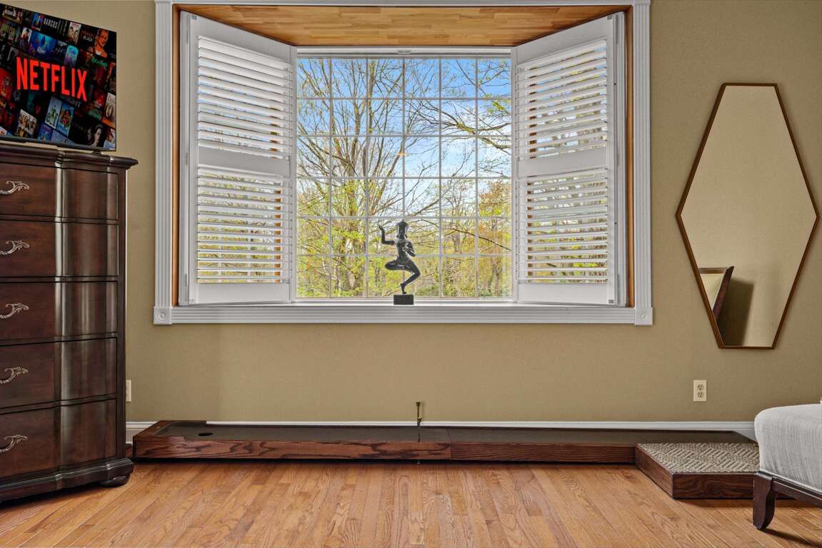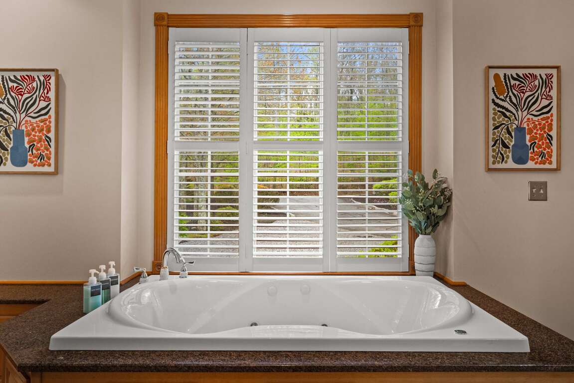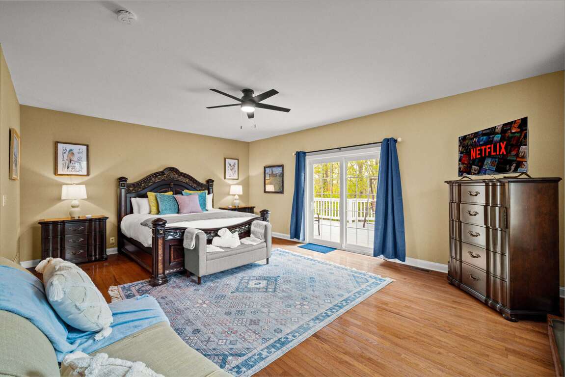 ● Master bedroom suite w/ king bed, TV, jacuzzi tub, tiled shower, double vanity, walk-in closet & deck access