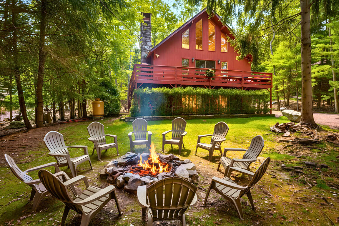 A charming 5-bedroom cabin in Lake Harmony, PA offering an array of amenities like a hot tub, pet-friendly accommodation, and proximity to popular skiing destinations: Gin Joint