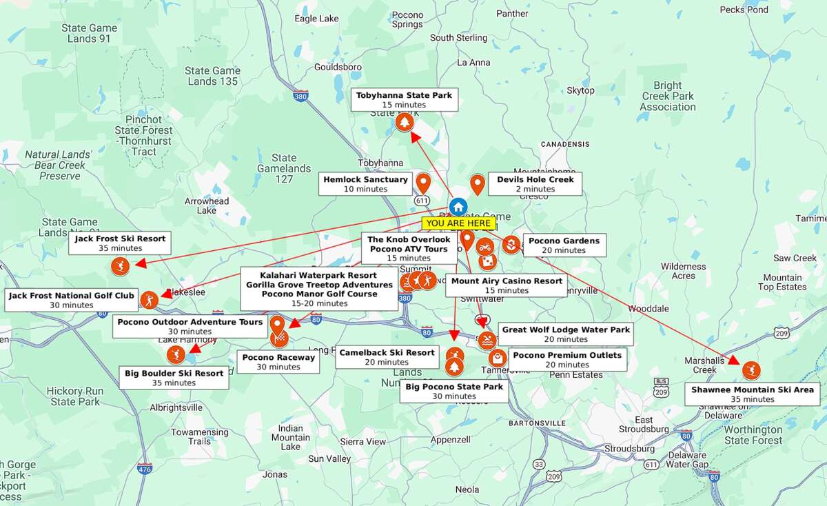 β Close to major Poconos attractions (Camelback Ski Resort, Kalahari Resort, Mount Airy Casino, Great Wolf Lodge, etc.)