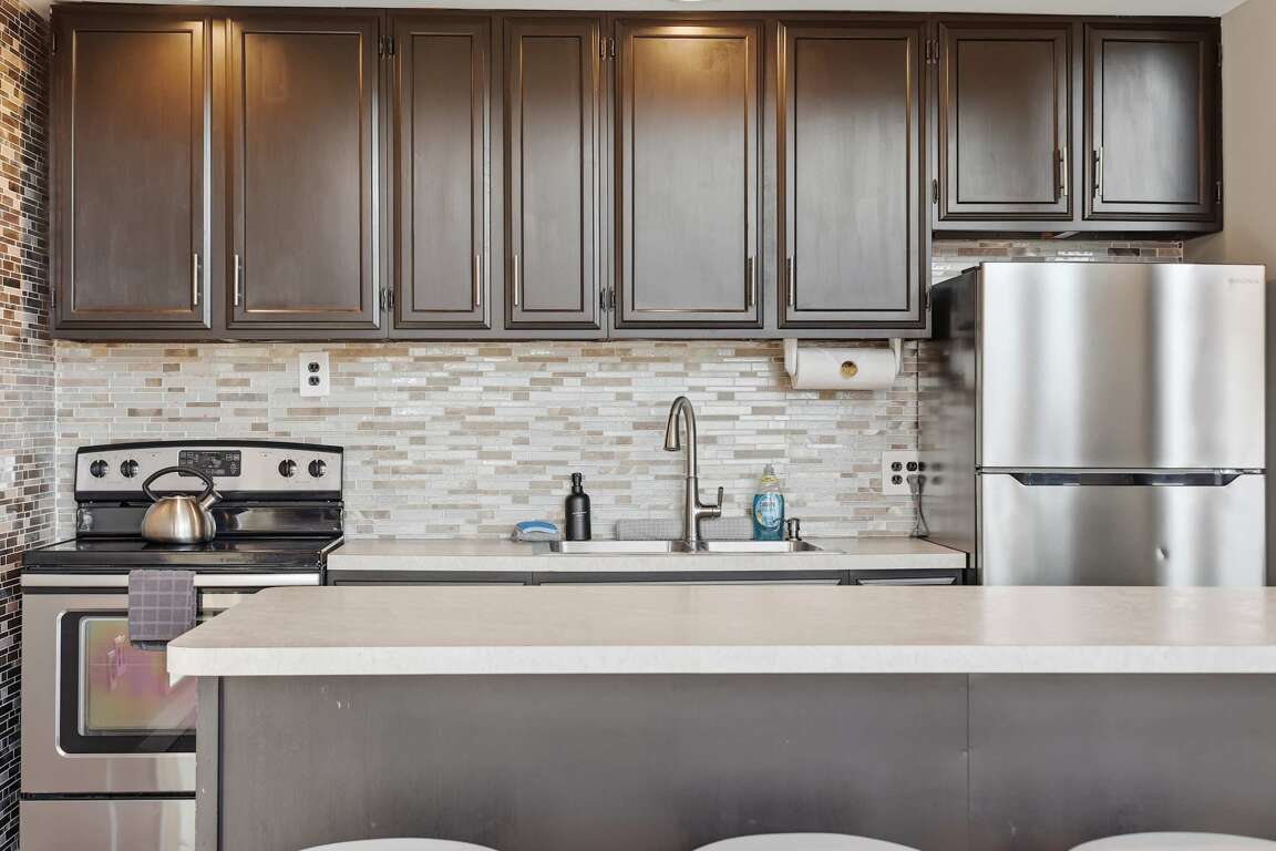 โ Stainless steel appliances - fridge/freezer, electric stove/oven, microwave