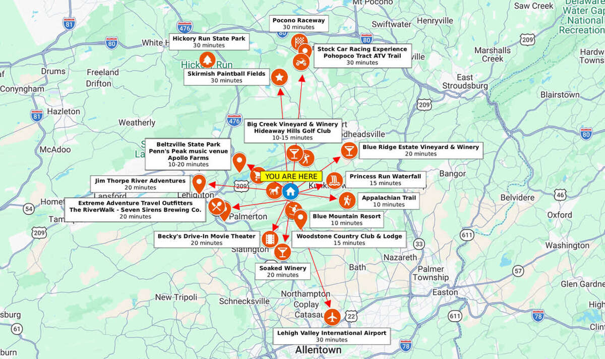 โ Close to premier Poconos attractions - Blue Mountain Resort, Jim Thorpe, Appalachian Trail, Lehigh Gap Nature Center, Beltzville State Park, & more!