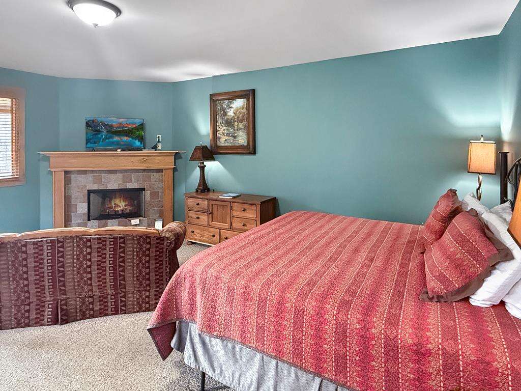 Step into an inviting open-concept suite anchored by a king-sized bed and a gas fireplace, creating a romantic and tranquil ambiance. A 42" Smart TV sits above the indoor fireplace, perfect for movie nights or unwinding after a day of exploring nearby trails and waterfalls.