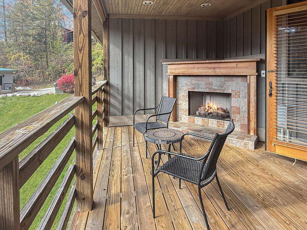 Just beyond the cozy living area, glass doors lead to your covered deck—complete with seating and a second gas fireplace. Sip morning coffee with views of the resort grounds and surrounding woods, or end the evening by the fire as the sun fades behind the mountains.
