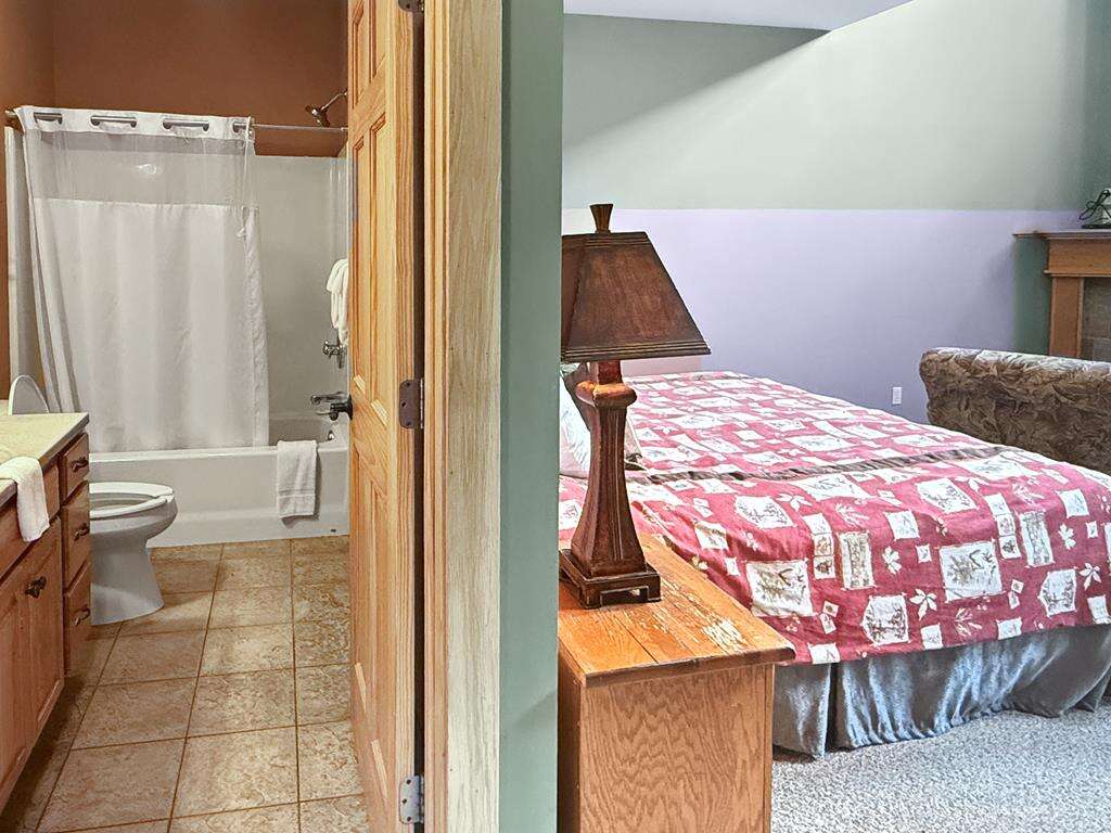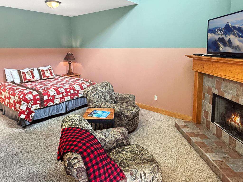 The main level welcomes you with a plush king-sized bed, a sitting area with armchairs, and a gas fireplace that sets the tone for restful mountain evenings. A 42" Smart TV (bring your streaming passwords) sits above the mantel, perfect for relaxing movie nights.