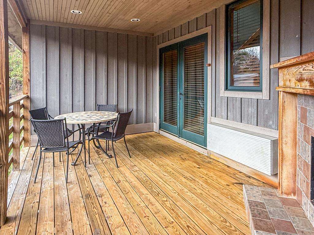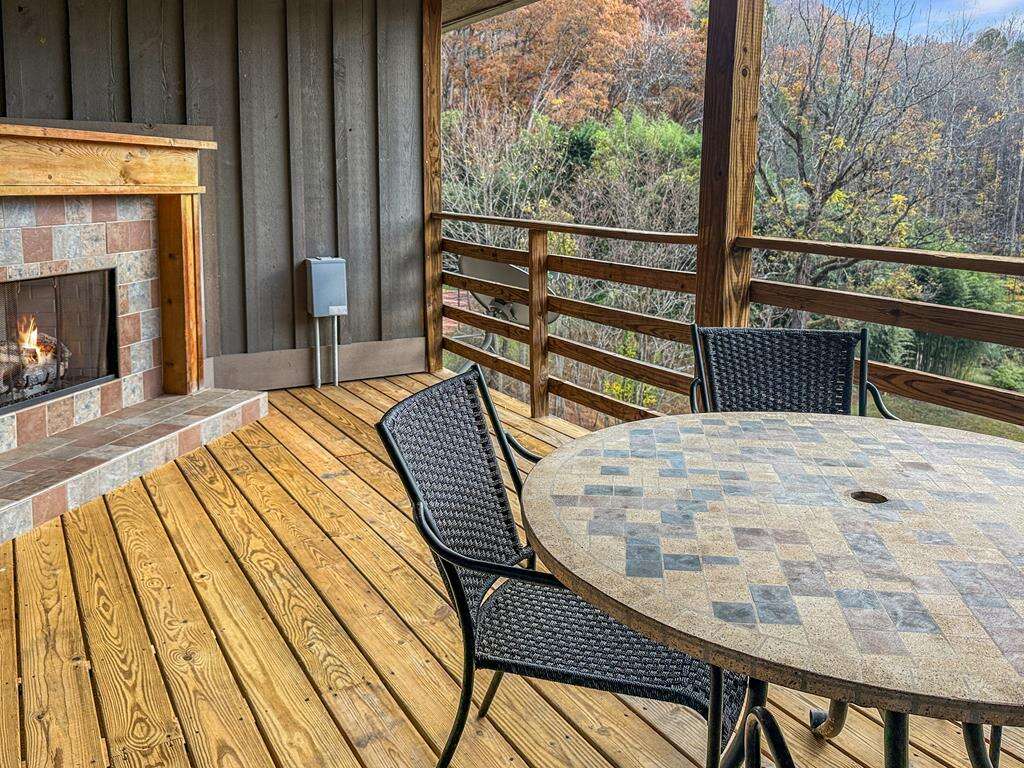 Glass doors open to your covered deck, where you’ll find outdoor seating and a second gas fireplace—the ideal spot for morning coffee, quiet reading, or an evening glass of wine as the fire flickers and mountain air drifts by.