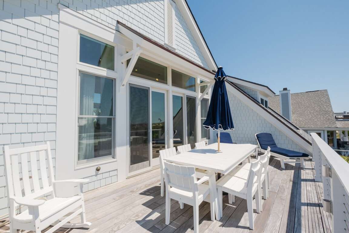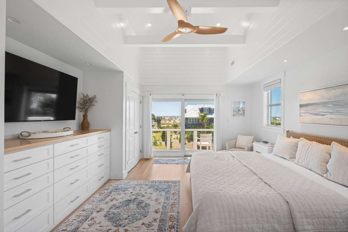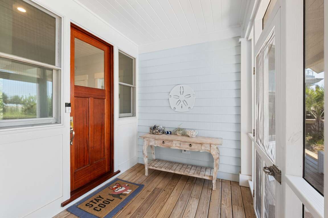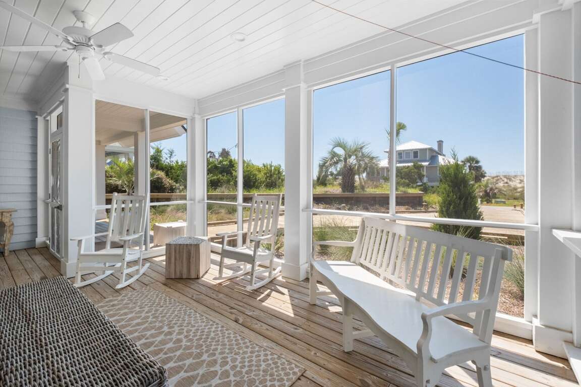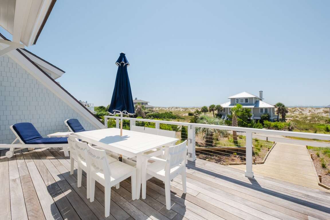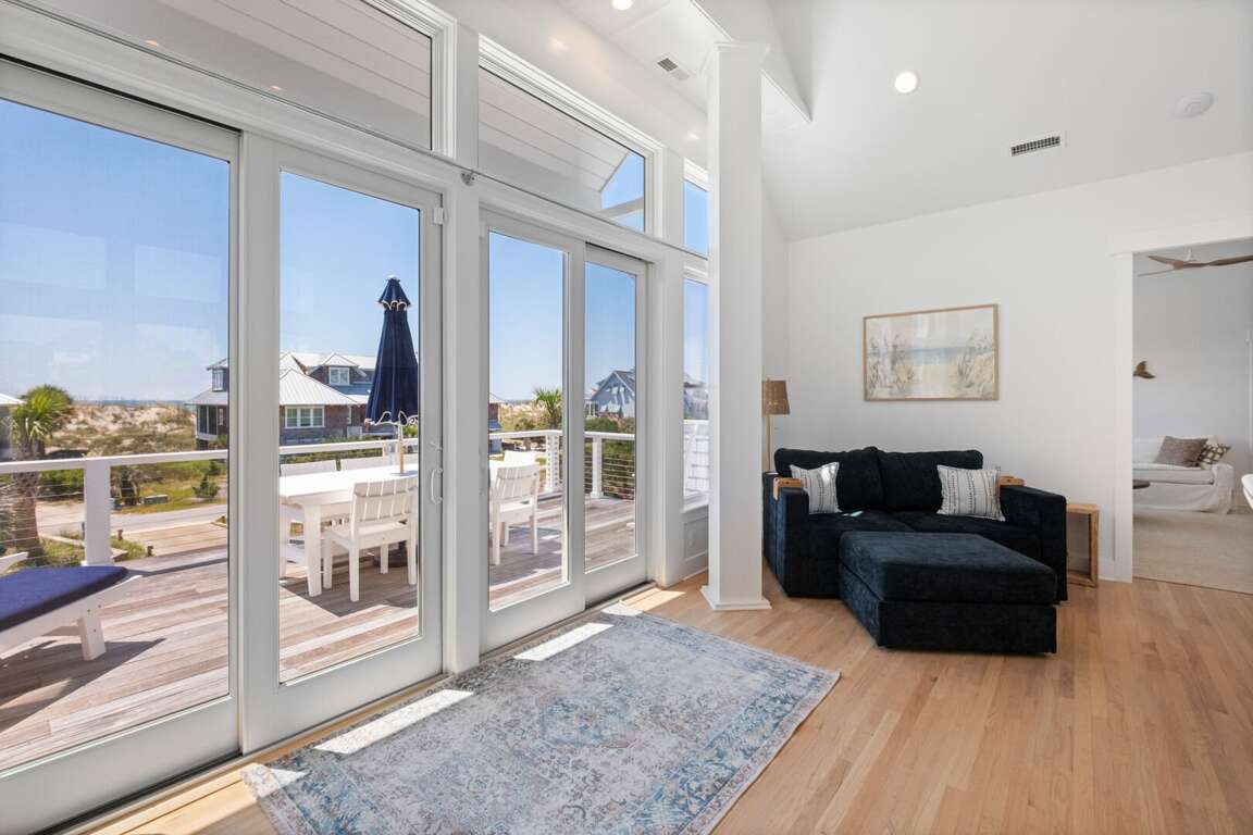 ensuite. This level also provides access to a quiet, shaded back grilling deck and the laundry. As you traverse up the stairs, you’ll appreciate this home’s contemporary industrial touches-including corrugated aluminum stair risers, wainscoting and stainless pipe stair rails. Round the corner at the top of the stairs and the second floor’s mammoth open living/dining space astounds with its soaring ceilings, sparkling seascapes from every angle-through loads of windows and doors-and exceptional spaciousness. You can choose to dine inside at the generous custom table enveloped by gorgeous views or al fresco on the oversize dining/sun deck featuring enchanting ocean panoramas. An eleven foot granite island anchors the huge kitchen and offers breakfast bar seating as well as space for multiple chefs. You’ll also find high-end stainless appliances here as well as a wine cooler, a wet bar, an ice maker and comfy seating for conversing during snack or meal prep. Barn doors beyond this area reveal a cozy living space, perfect for family movie-watching or games. The detached crofter proffers a very private fourth bedroom furnished with two twins and featuring another full bath. Centrally located on the Island near shops and the Conservancy, between the two Clubs, and steps from the beach, you won’t be able to beat a vacation at Ocean’s 11!