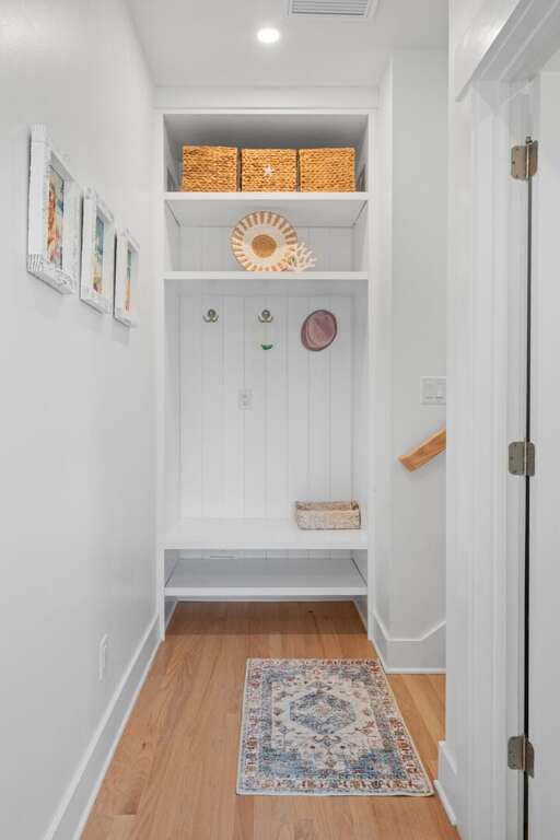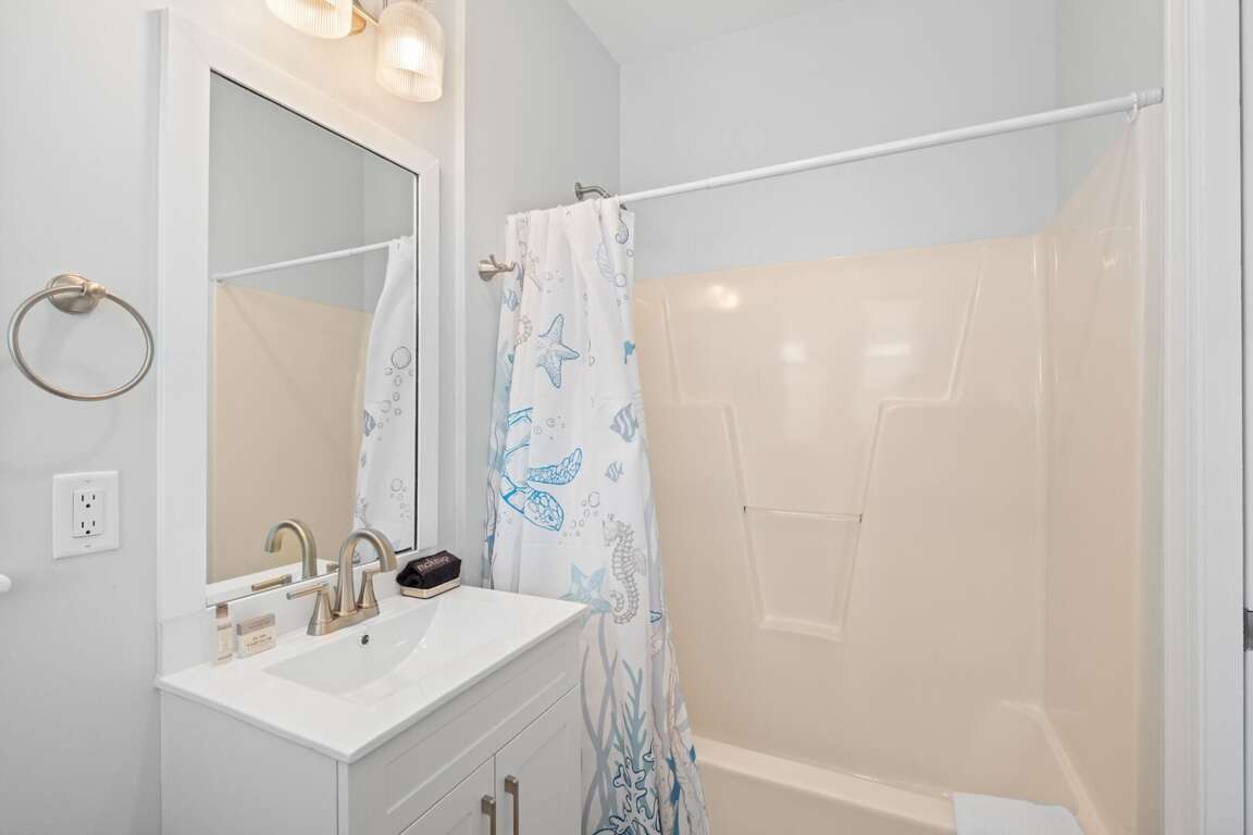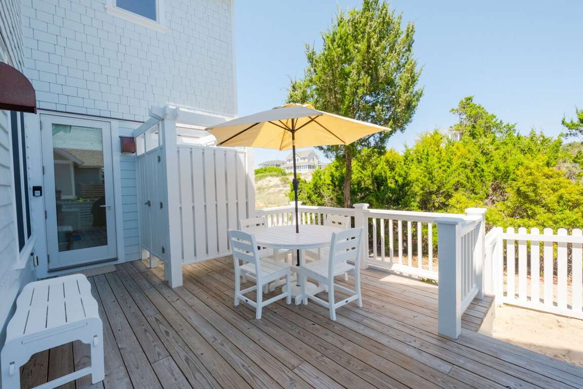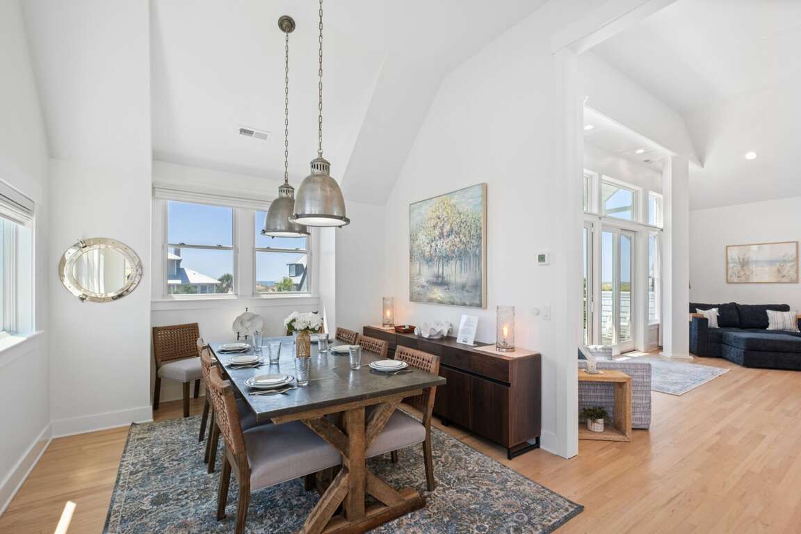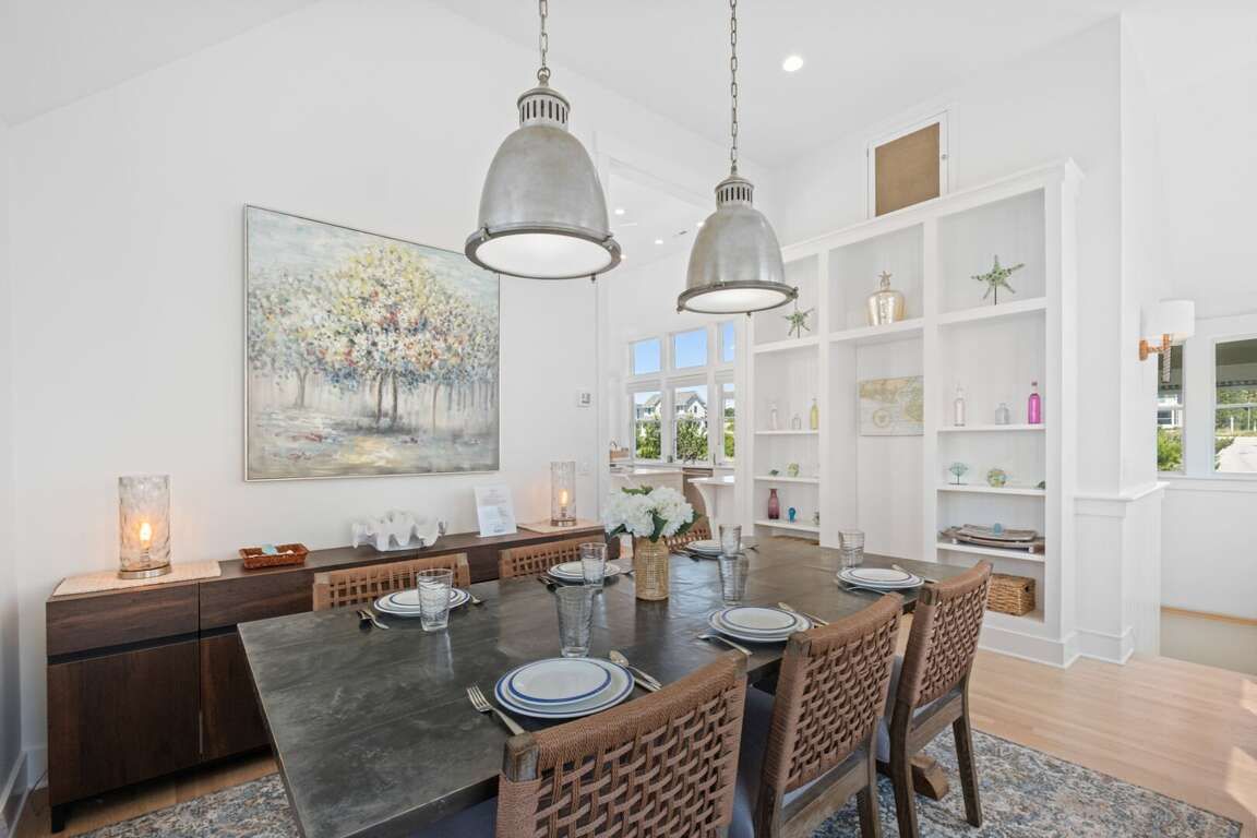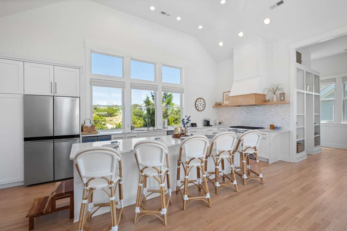 ensuite. This level also provides access to a quiet, shaded back grilling deck and the laundry. As you traverse up the stairs, you’ll appreciate this home’s contemporary industrial touches-including corrugated aluminum stair risers, wainscoting and stainless pipe stair rails. Round the corner at the top of the stairs and the second floor’s mammoth open living/dining space astounds with its soaring ceilings, sparkling seascapes from every angle-through loads of windows and doors-and exceptional spaciousness. You can choose to dine inside at the generous custom table enveloped by gorgeous views or al fresco on the oversize dining/sun deck featuring enchanting ocean panoramas. An eleven foot granite island anchors the huge kitchen and offers breakfast bar seating as well as space for multiple chefs. You’ll also find high-end stainless appliances here as well as a wine cooler, a wet bar, an ice maker and comfy seating for conversing during snack or meal prep. Barn doors beyond this area reveal a cozy living space, perfect for family movie-watching or games. The detached crofter proffers a very private fourth bedroom furnished with two twins and featuring another full bath. Centrally located on the Island near shops and the Conservancy, between the two Clubs, and steps from the beach, you won’t be able to beat a vacation at Ocean’s 11!
