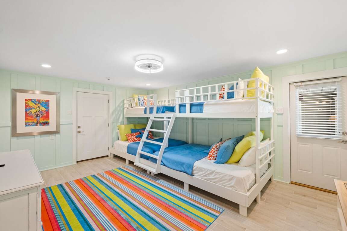 Down the planked drive of this three-story sparkler, you'll find two garages (housing three Bintelli golf carts available for guest usage-two four-passenger carts and a six-passenger cart) as well as the outdoor shower and entrance to the home's kid suite/rec room. This area, with its own large full bath, is furnished with two bunks and is the perfect place for lounging, game-playing, and movie-watching.<br />