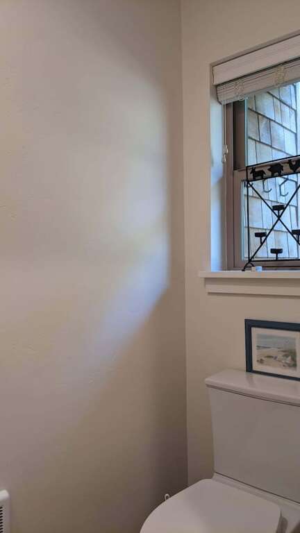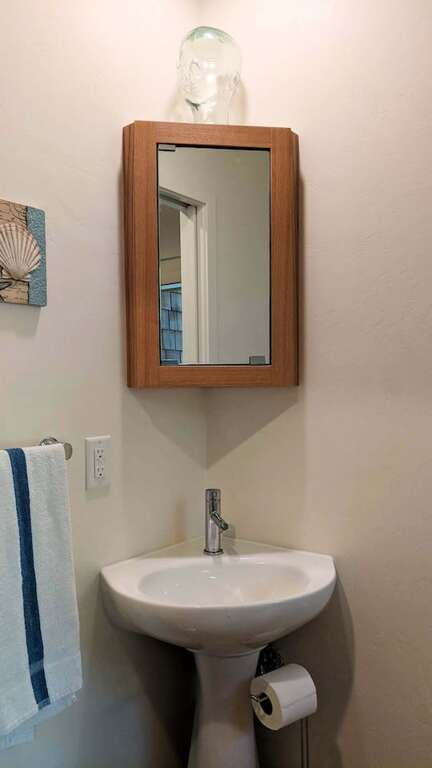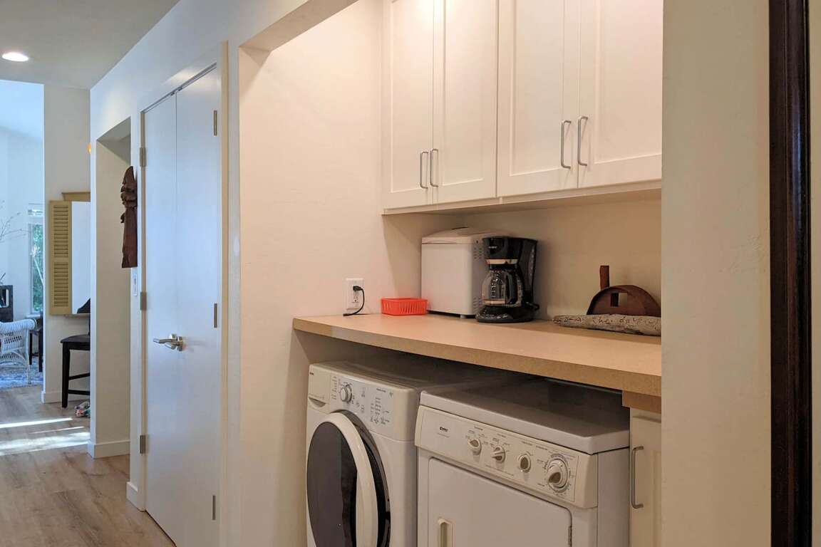 A full-size front loading washer & dryer in the hallway, with iron, ironing board, folding area, complete the clean clothes scene, complemented by a large adjoining utility closet with folding drying rack, ample hanging space, and is also suitable for luggage stowage during your visit. The spacious bathroom features a large shower with seat and handheld option. An additional ½ bath is handy to the coat and shoe storage areas and leads out to another deck with dining table and woodside gardens.