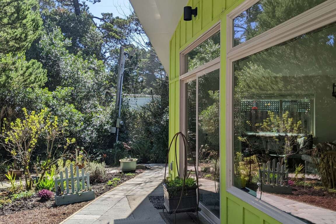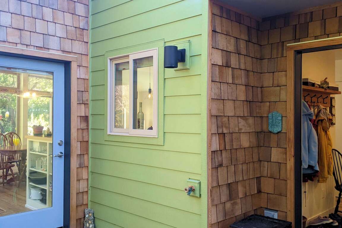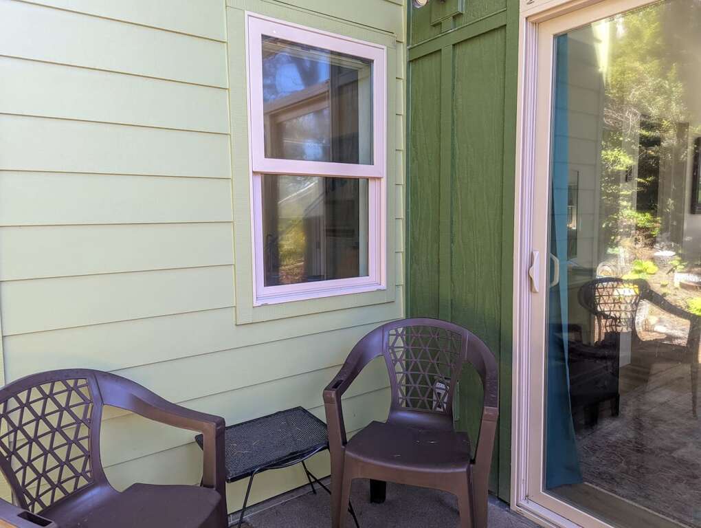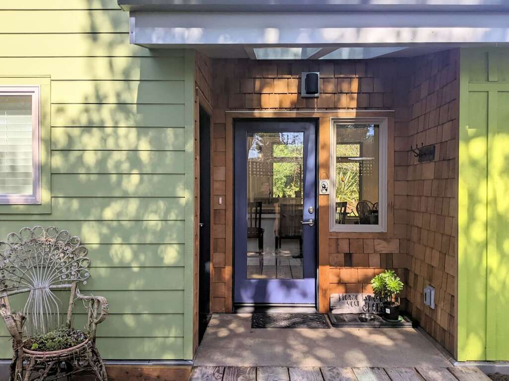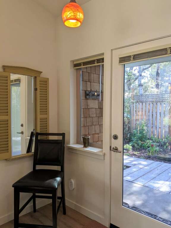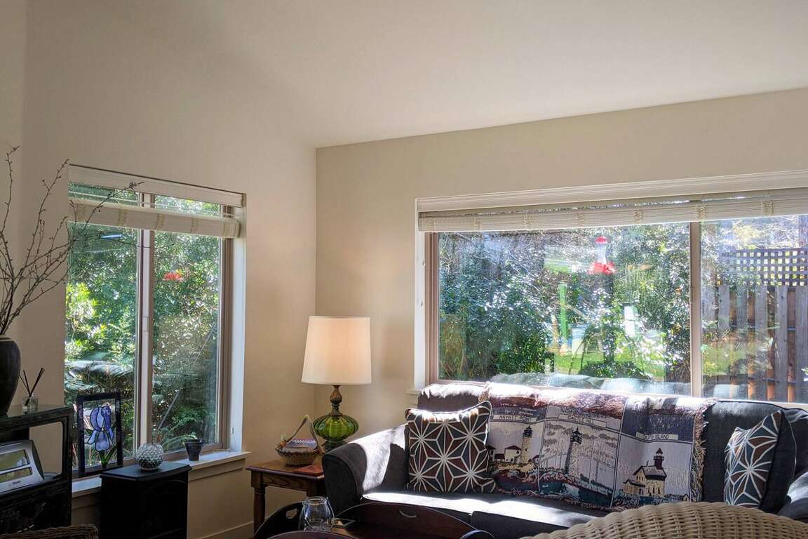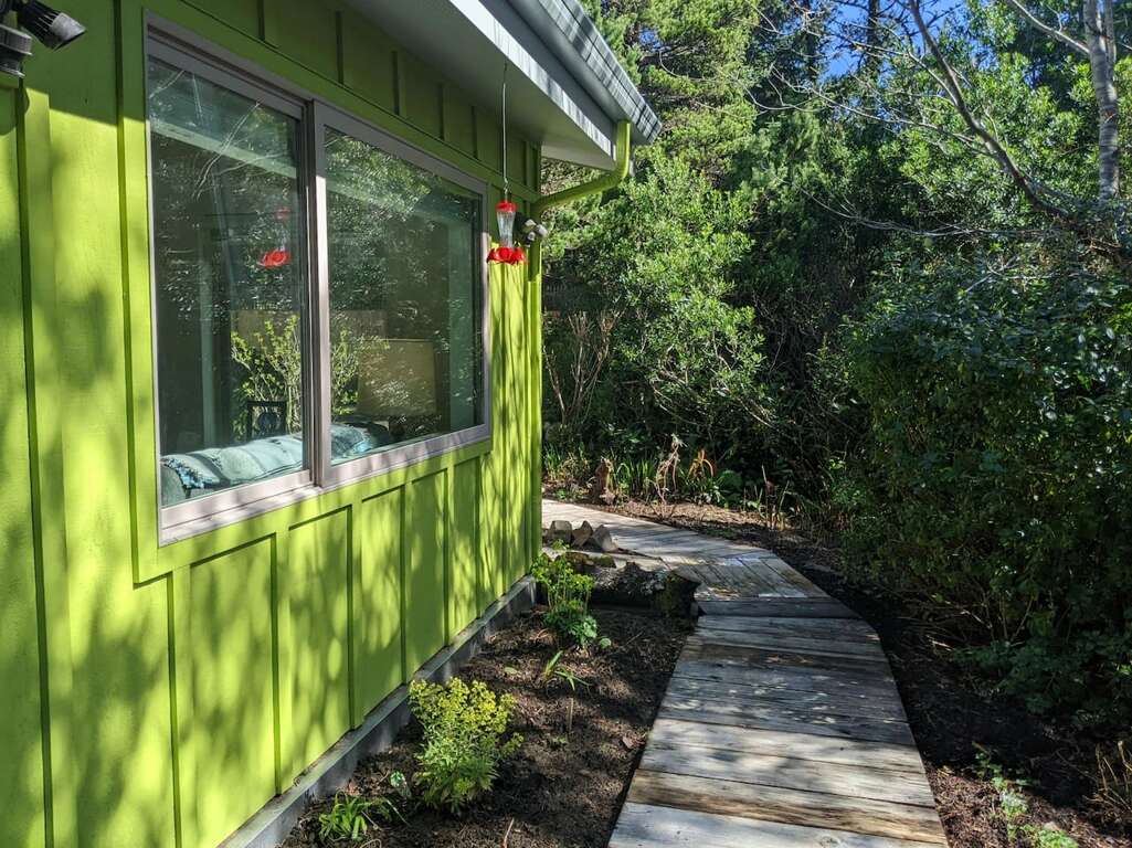 Once inside, the open floor plan with kitchen, living room, and dining room welcome you to 1100 square foot recently (2020) built home. Vaulted ceilings, large windows, and step-free entry from car to most outside entrances invite the outside in- and the inside out to the varied, and sometimes whimsical gardens and coastal forest. A separate entry to an to an apartment above is only used during the owners. occasional visits.