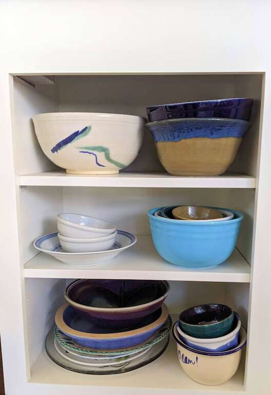 The kitchen caters to those who like to socialize while cooking, having a large center island with seating for four, an unusual 5 burner electric range (with typical microwave above and of course a dishwasher), a very accessible French door refrigerator/freezer, and generously sized cabinets. The cooking tools, gadgets, and cooking and serving ware are supplemented with a stand mixer, bread maker, panini grill, blender, coffee maker, and even a waffle iron.