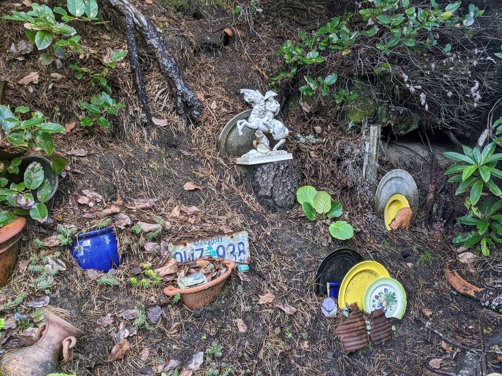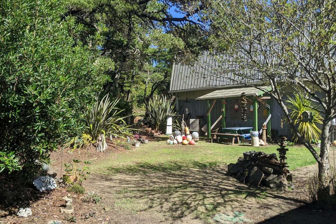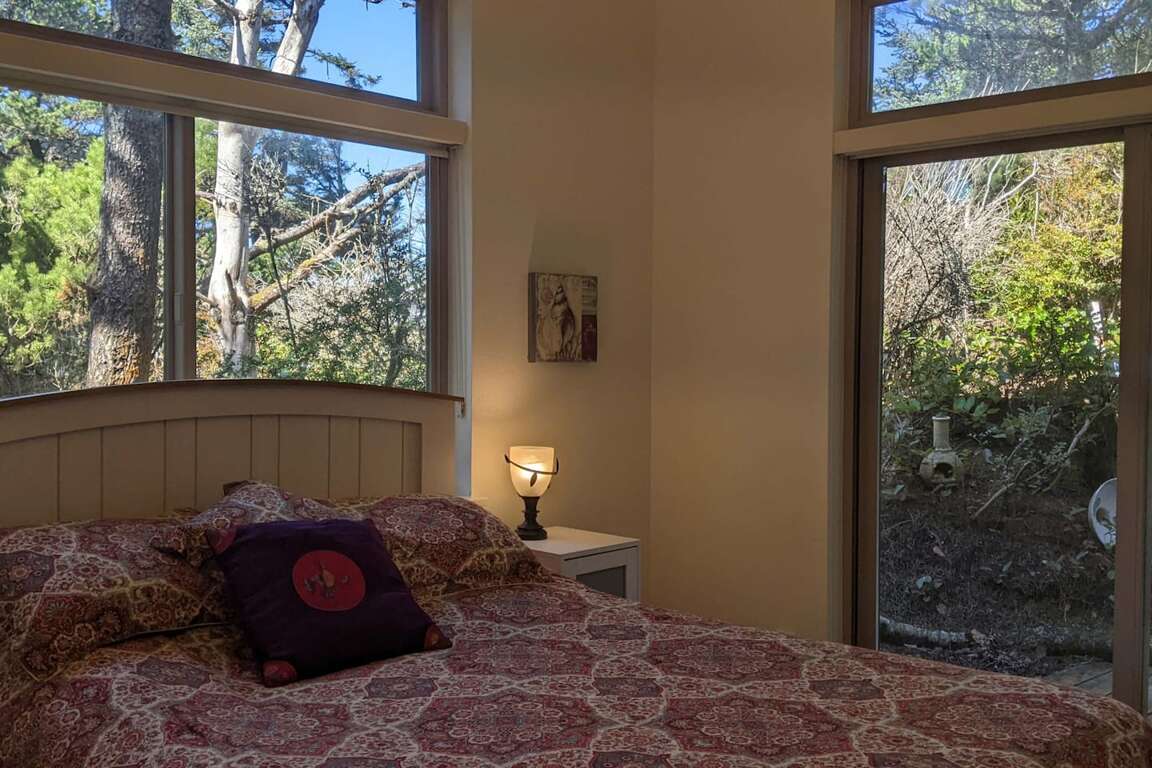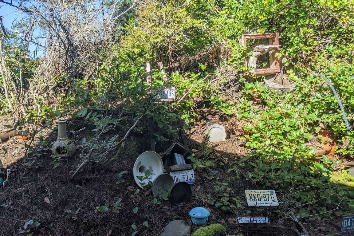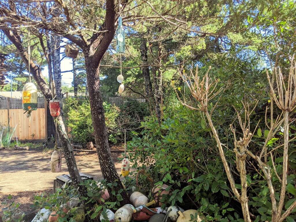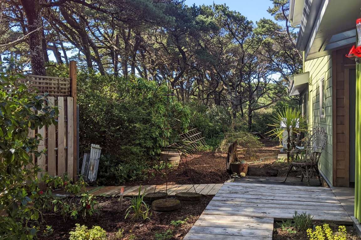 For the slightly adventurous, a one-time sand knoll, now forested, lies beyond a pergola to the "wild side" of the property. Large trees crown the top, where the beam from Heceta Head lighthouse can sweep eerily past on misty nights. Bring a collapsible chair (hanging just inside the side door to the garage) to sit and read a book and feel like you're in the wilderness (you are!). While wandering about the property, be entertained by the unexpected? can you find the gnomes?