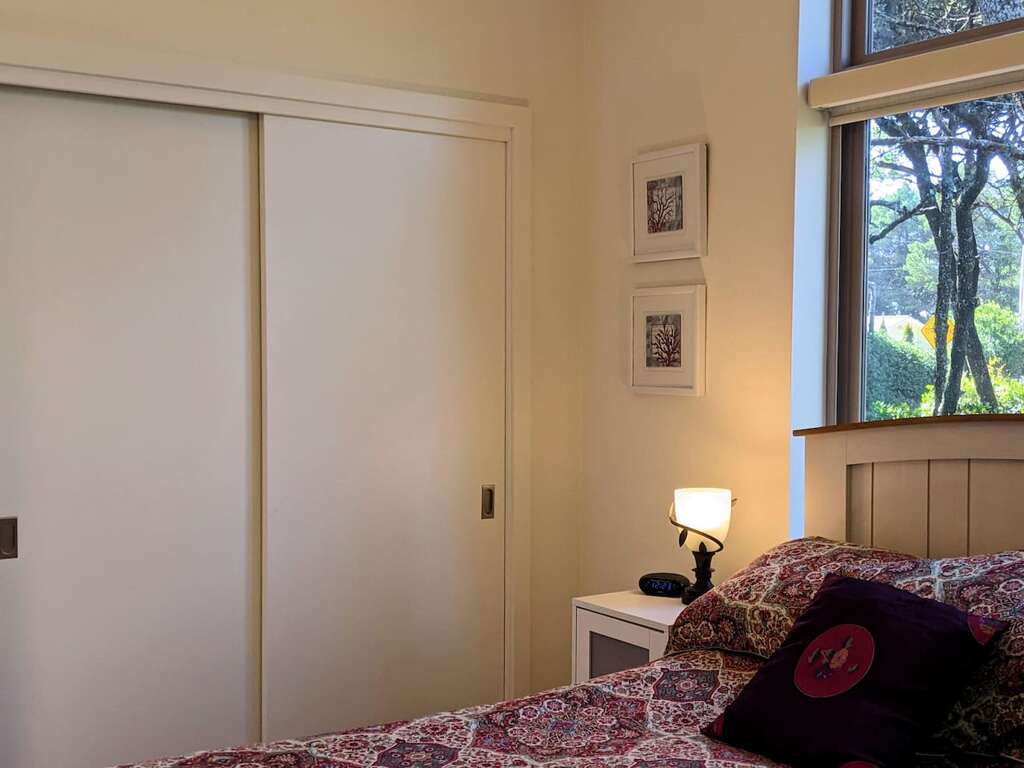 The amply-sized bedroom has a queen size bed, large closet, a direct door to the bathroom, and a sliding glass door out to a private deck with a view of the hillside garden (early cup of coffee, anyone?). There's also another streaming TV.