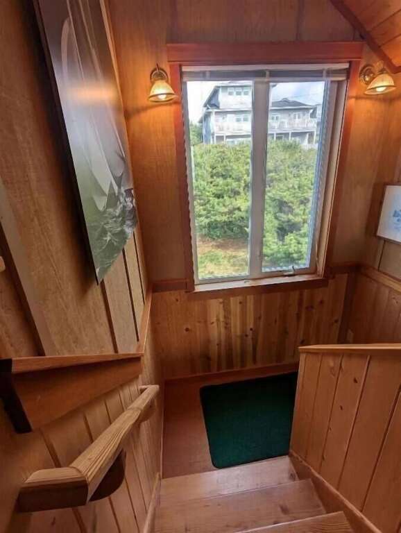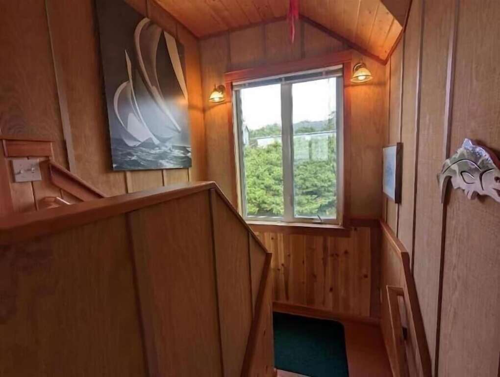 Venture up the inviting inside staircase to the second floor, where the charm continues to unfold. At the top, an open loft awaits, featuring a twin bed, a desk, and a TV—perfect for both relaxation and quiet reflection. Beyond the loft lie two additional queen bedrooms and another thoughtfully appointed bathroom. From the north bedroom, you’ll be treated to a mesmerizing view of the iconic lighthouse and the enchanting sea lion caves, a reminder of the natural wonders that surround this serene sanctuary.