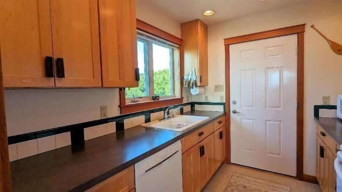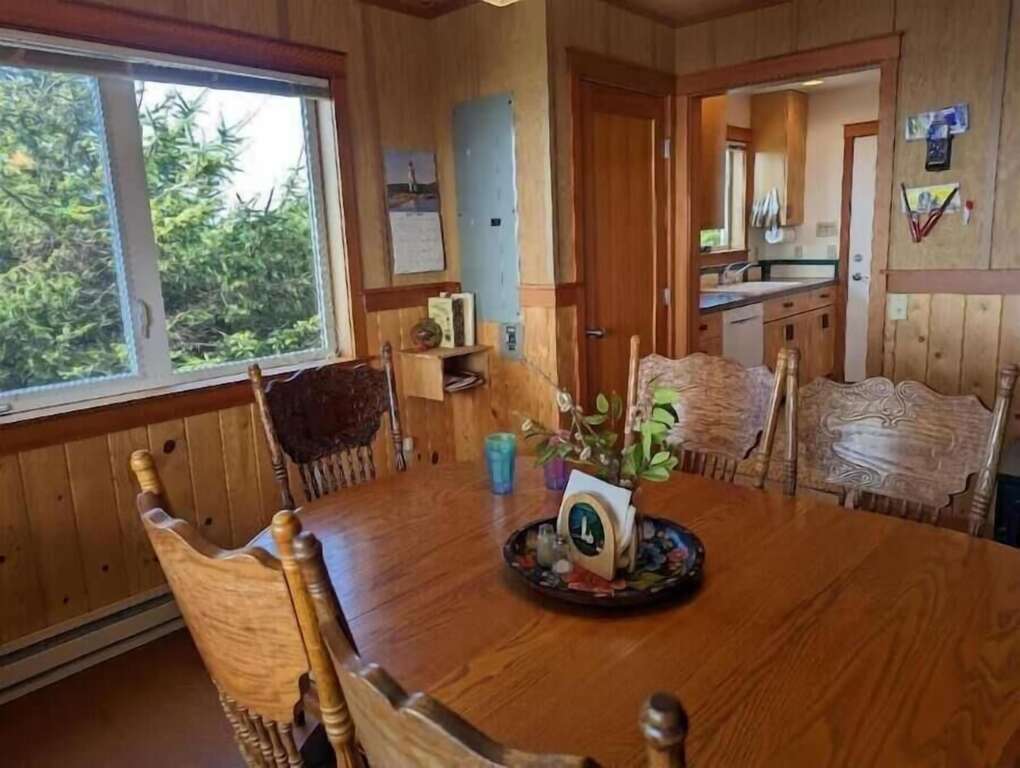 Ascending the picturesque staircase shown in the photo, you’ll find yourself welcomed into the heart of the home: the main living area. Here, the galley kitchen, dining room, and living room seamlessly come together, each space bathed in light and offering breathtaking vistas that stretch as far as the eye can see. This level also houses a cozy queen bedroom, a convenient bathroom, and a well-equipped laundry room. Step out onto the back deck to soak up the golden rays of the morning sun, or retreat to the grand front porch—an ideal perch for marveling at the majestic dance of whales, the graceful flight of pelicans, and the stately presence of bald eagles, along with the chorus of countless other coastal birds.
