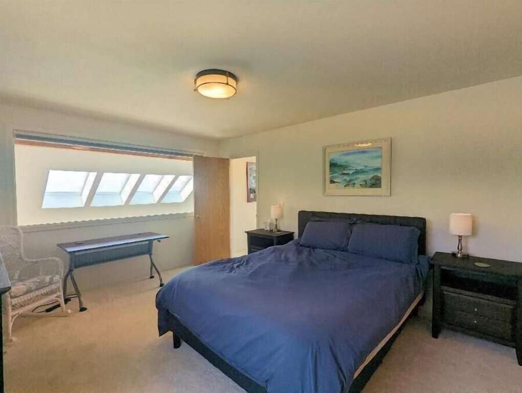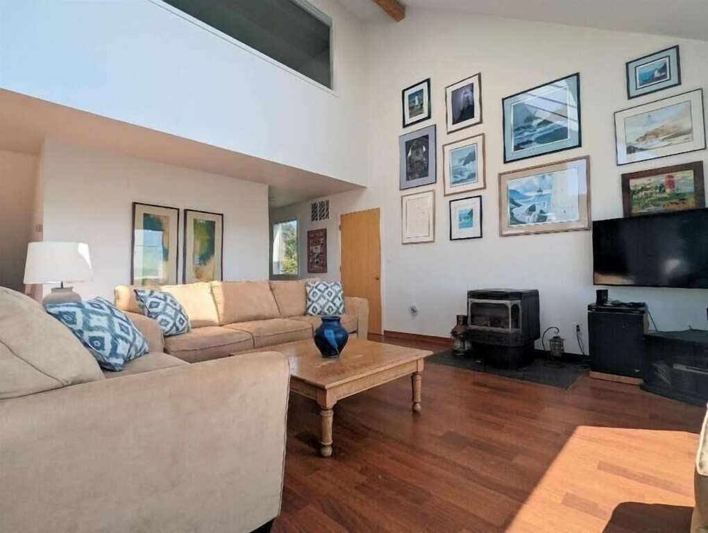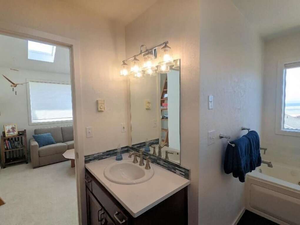 But this is only the beginning; The third floor has the master suite. The master bedroom with a queen bed, a desk, in case you need to escape for a zoom meeting. Also on this floor is a family tv room with a sofa and Roku, plus a bathroom with two vanities and a jacuzzi tub. From this sitting area you can survey the whole neighborhood and beach including views of the Heceta Head lighthouse.
