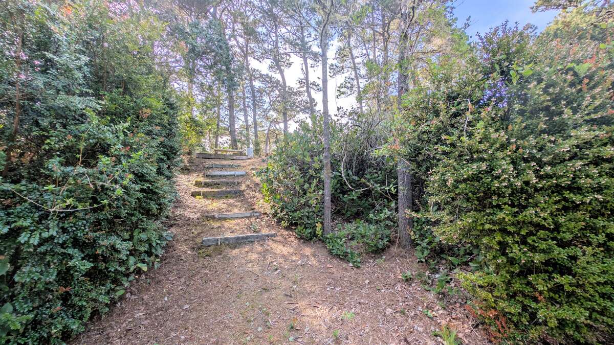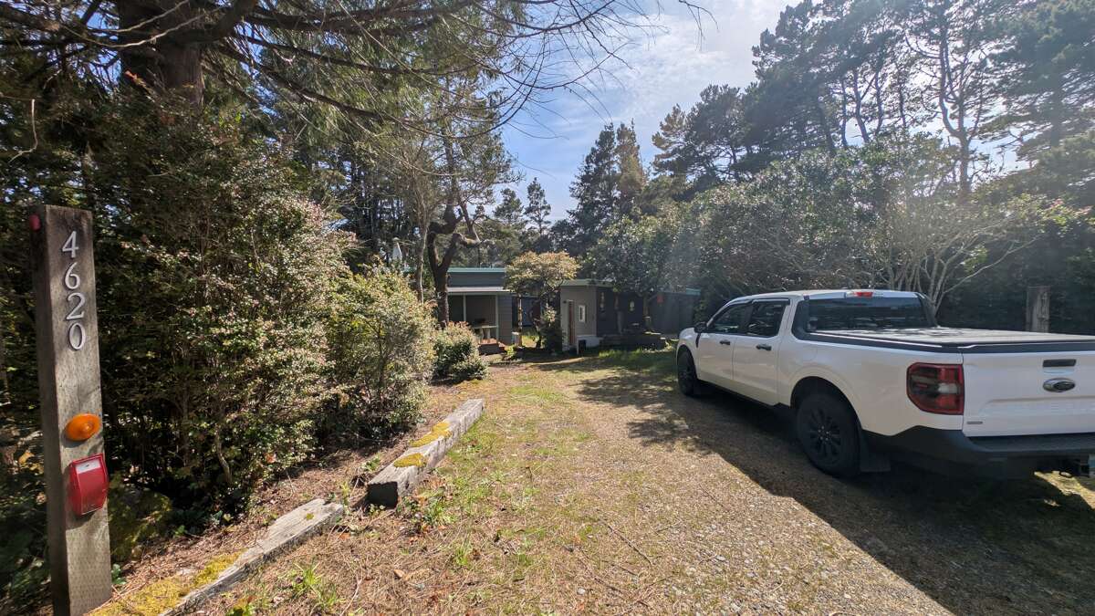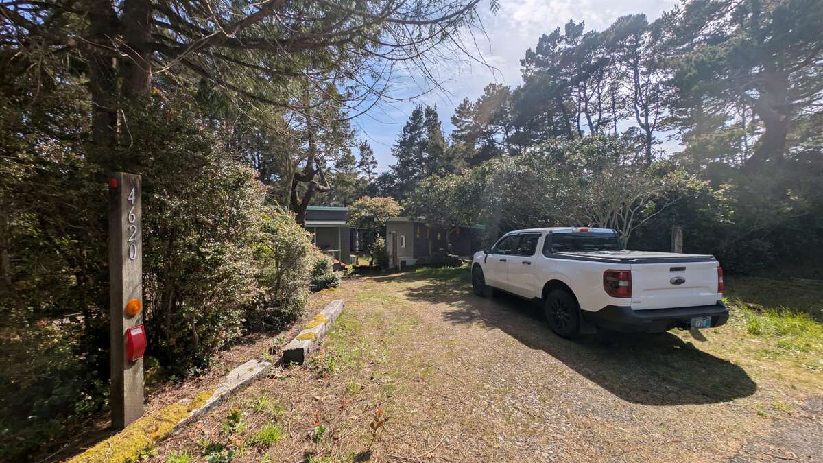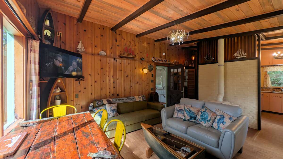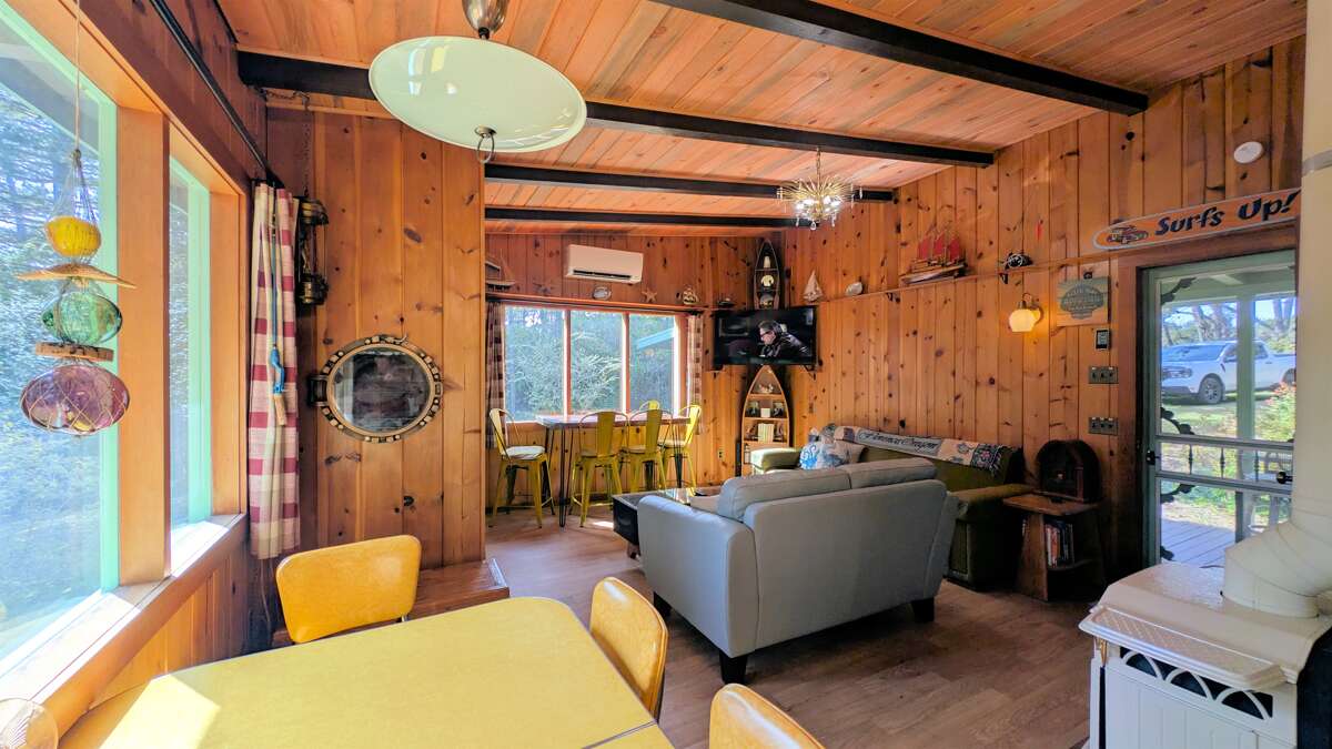 Tucked into a quiet pocket of the coast, on a wooded double lot where wild rhododendrons bloom in spring and the trees seem to stand guard, this 1960 family cabin feels like stepping into a gentler era. The moment you walk through the door, the knotty pine walls wrap around you like a familiar quilt — warm, golden, and carrying the soft glow of six decades of family stories.