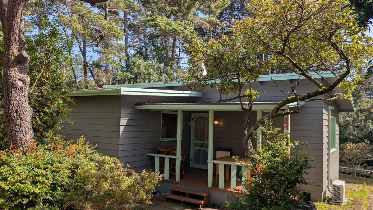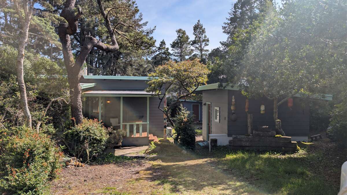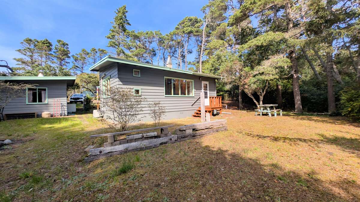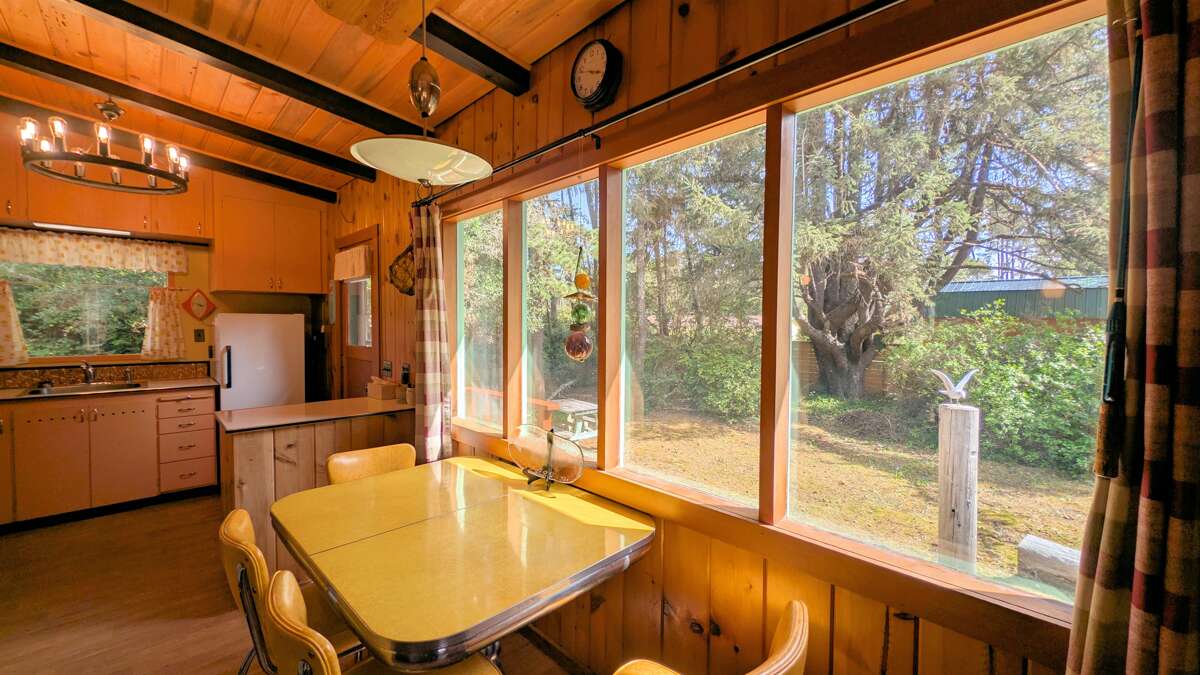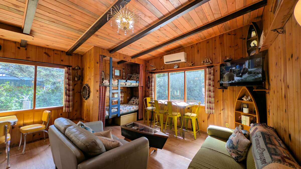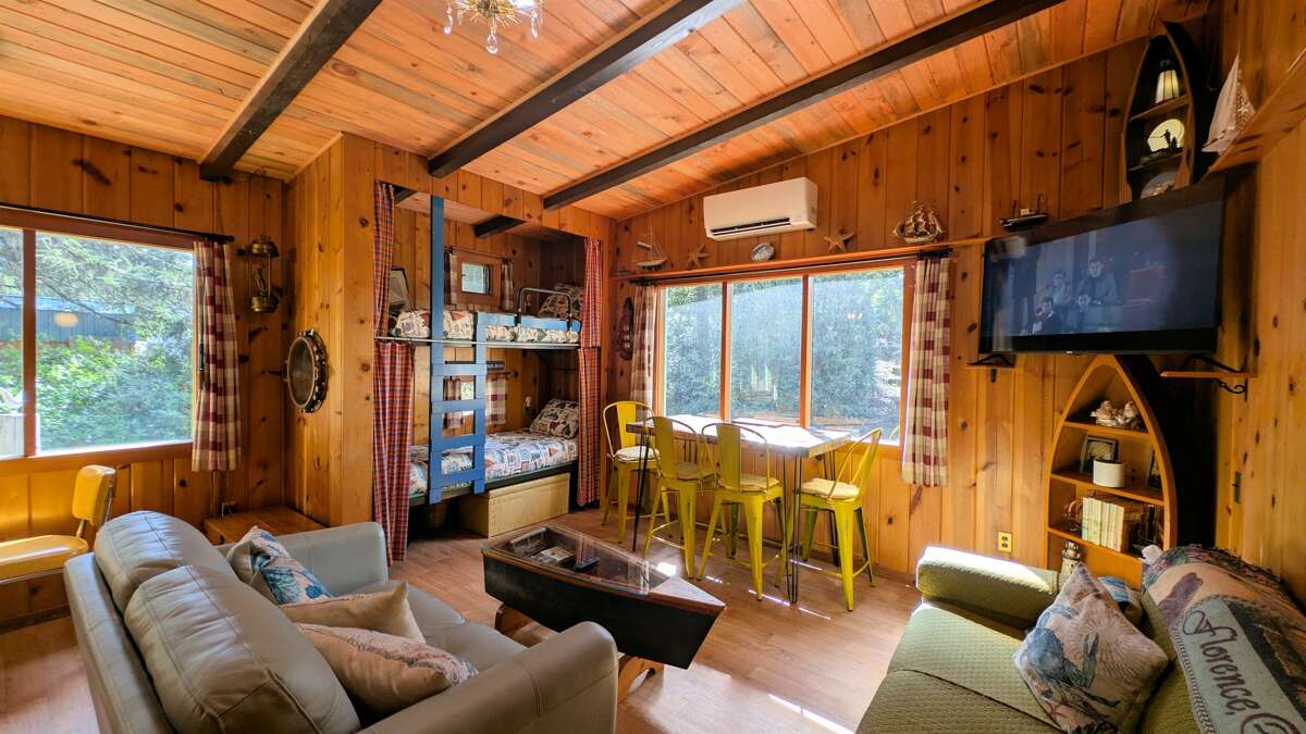 Cabin rental in Florence with a separate bunkhouse, vintage 1960s kitchen, and built-in bunk beds—an easygoing place to stay near coastal trails and beachcombing spots, set on a wooded double lot.