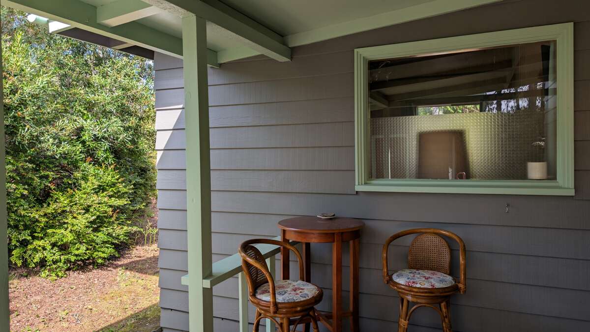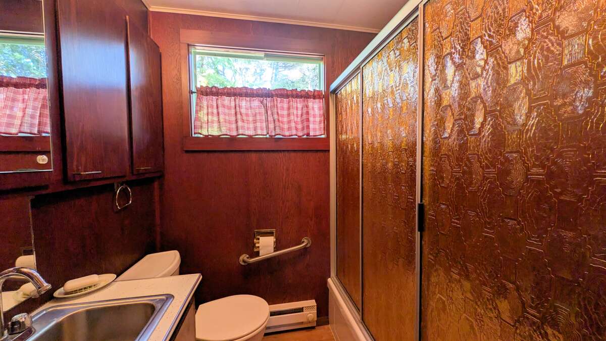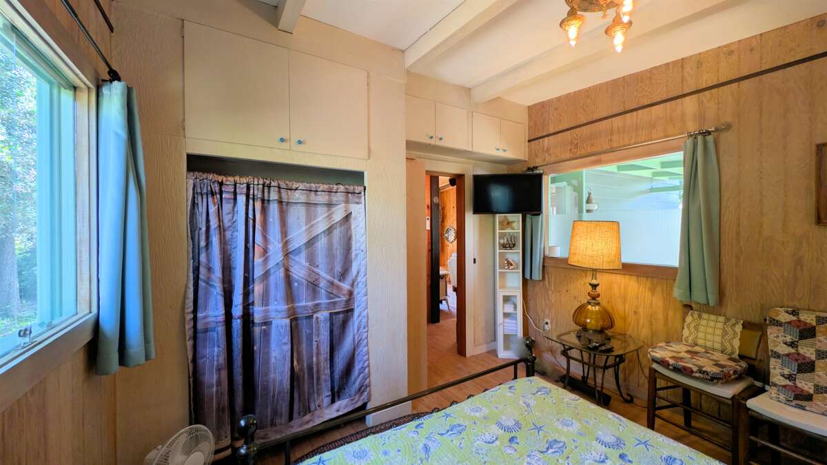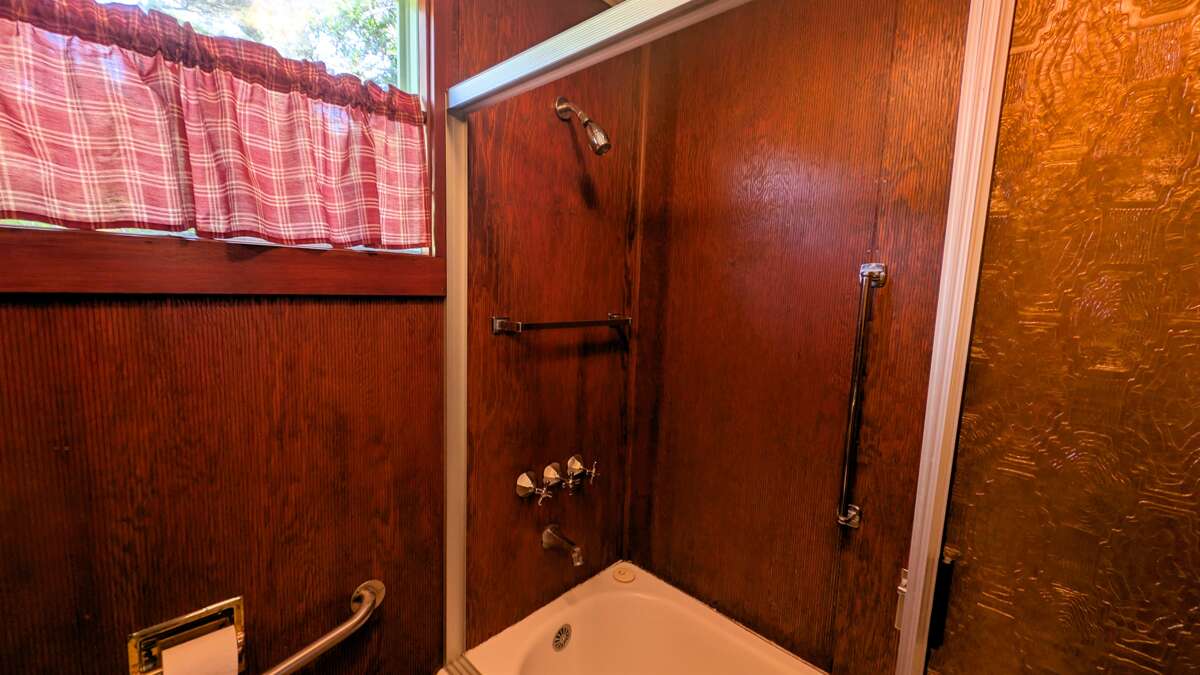 The cabin’s single queen bedroom is simple and serene, paneled in pine and filled with soft morning light. The bathroom, with its shower/tub combo, keeps its original charm while offering everything you need after a day of beachcombing or wandering the nearby trails.