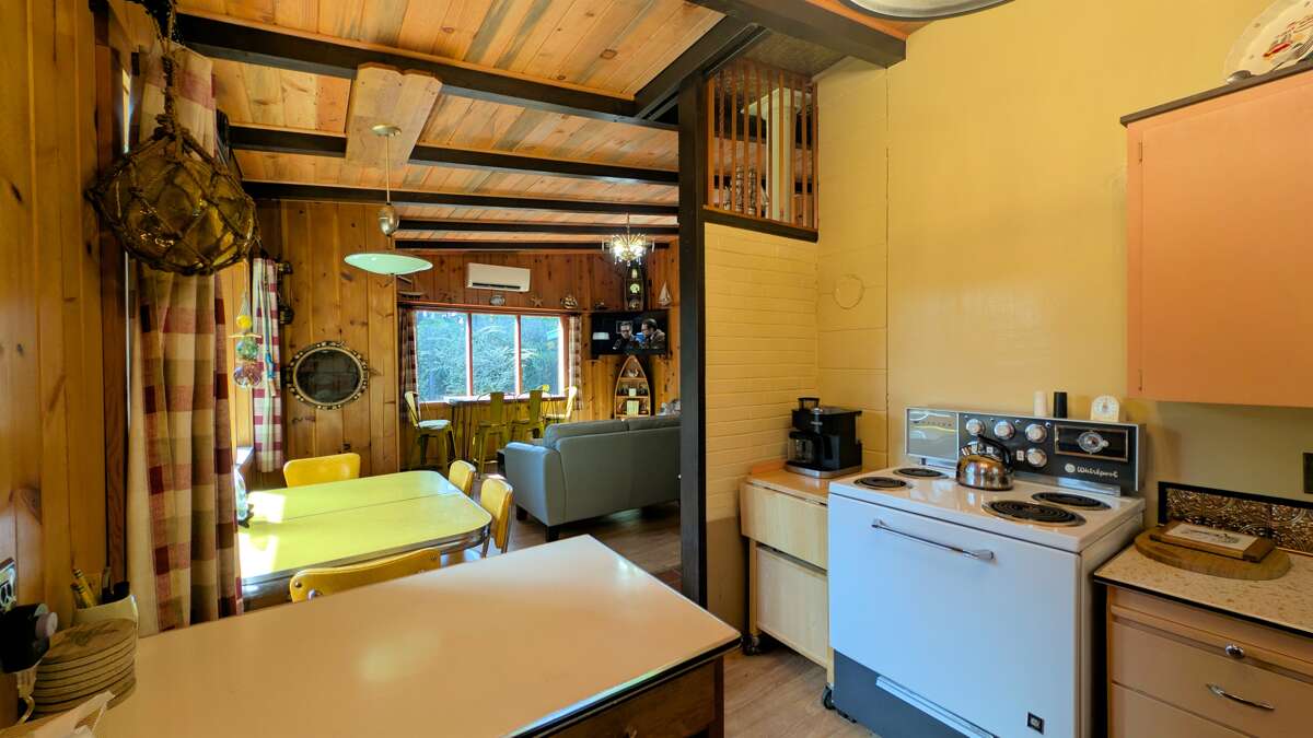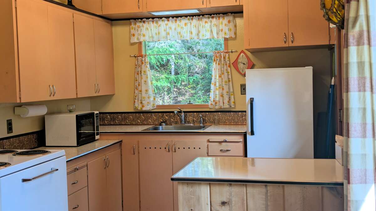 The heart of the cabin is its original sixties kitchen, a peach‑toned time capsule with confetti Formica in shades of peach and orange, the kind of cheerful palette that makes morning coffee taste just a little sweeter. The vintage range is a showstopper — the kind of appliance that has outlived trends and still hums with quiet reliability, ready for pancakes, grilled cheese, or whatever comfort food the coast inspires.