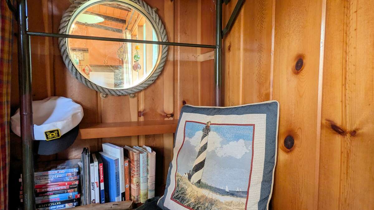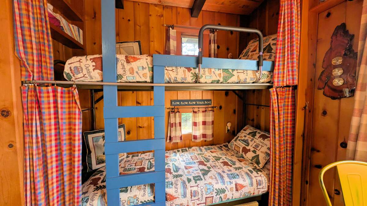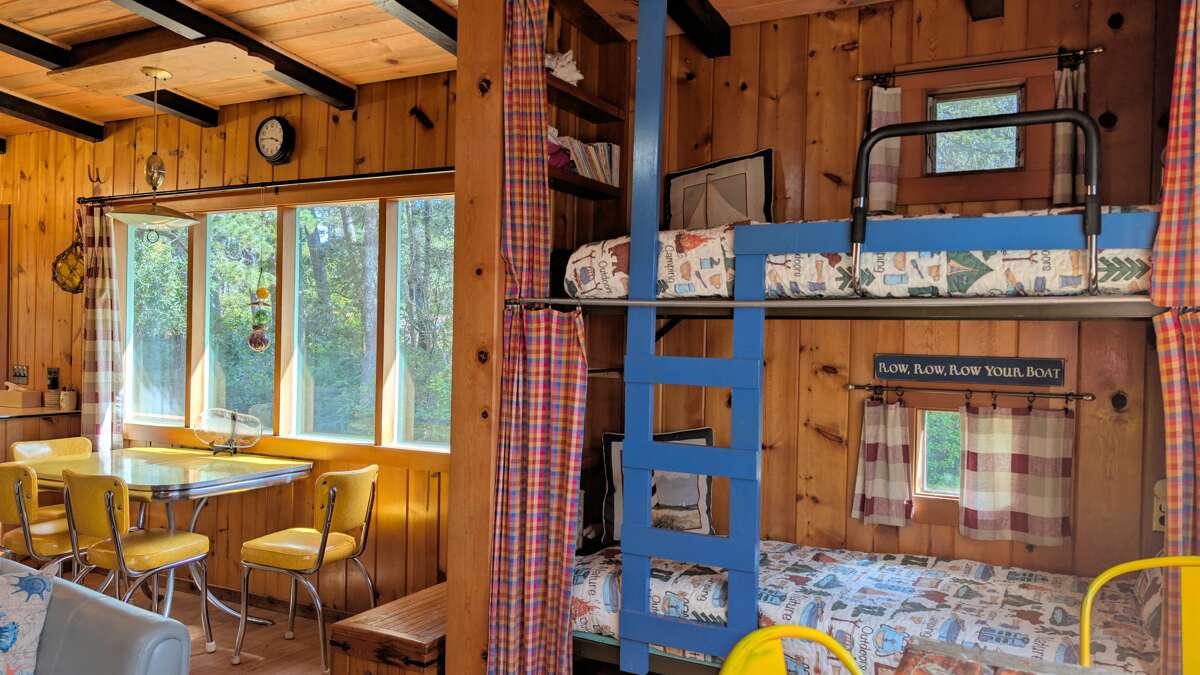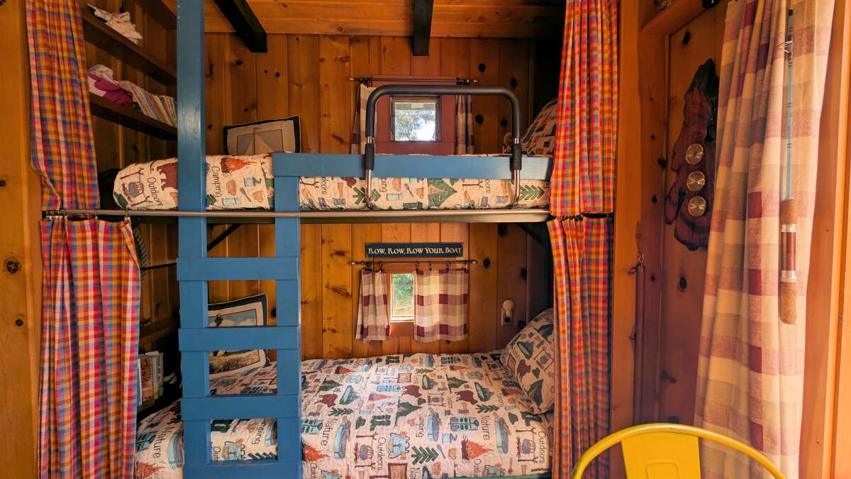 In the living room, built‑in twin bunk beds add a touch of childhood magic. Each bunk has its own privacy curtain — a cozy nook for reading, dreaming, or hiding away with a flashlight and a book while the rain taps on the roof. It’s the kind of detail that makes kids instantly fall in love with the place and adults remember what it felt like to be one.