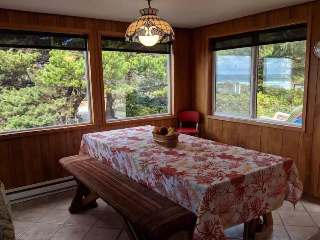 It has been updated over the years, with new vinyl windows throughout. The kitchen and dining area have ceramic tile floors & modern appliances but with the wonderful red countertops it hasn't lost it's sixties charm. The Dining Room has a large picnic table with padded seats that seats 8 and has a fantastic view. Also a great place to play games or do a jigsaw puzzle on those stormy days.