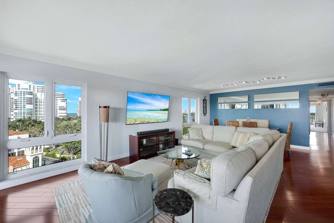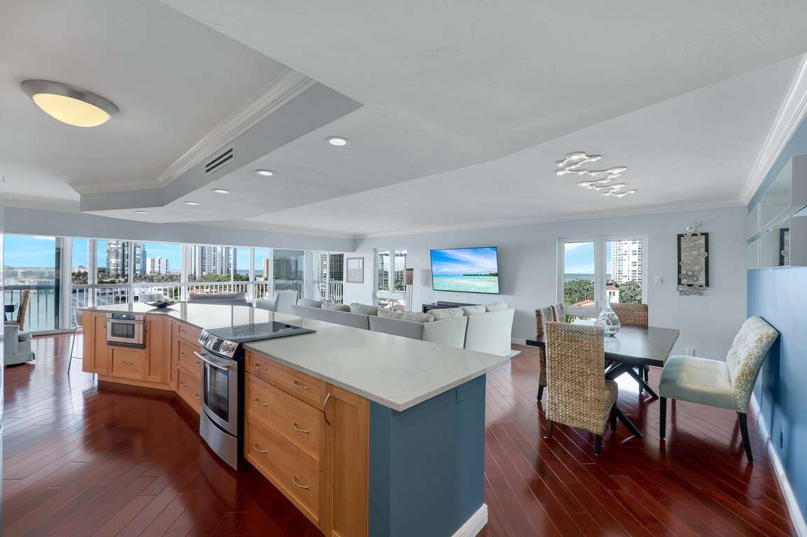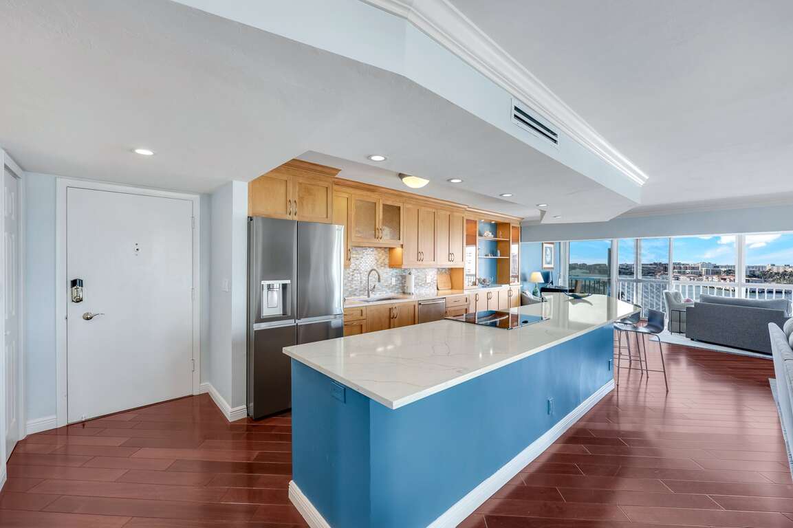 The interior features of this luxurious top floor end unit at Pelican Point West showcase modern sophistication and high-end finishes, creating a refined living space with attention to detail and comfort.