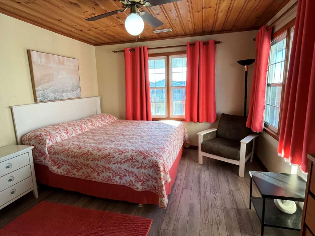 323 East First Street - THE BEACH HOUSE 1100 - Partial ocean view - easy beach access. This second row house features four bedrooms and two bathrooms on one level, and sleeps 10. Two of the bedrooms have a king bed. The third bedroom has a queen bed, and the fourth bedroom has a pyramid bunk (double on the bottom and single on the top) and a twin bed. The dining room table seats six, and there are four stools at the kitchen bar for additional seating.