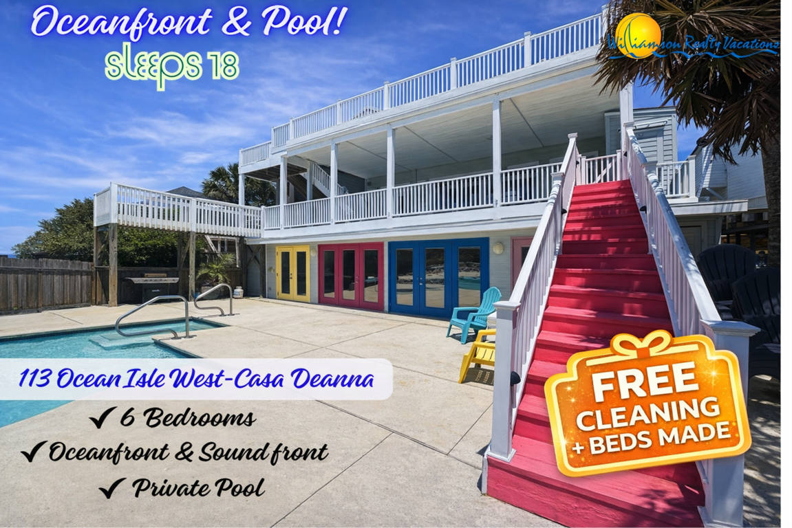 Casa Deanna is a comfortable 6-bedroom, oceanfront house located on Ocean Isle Beach, a desired vacation rental destination in NC.