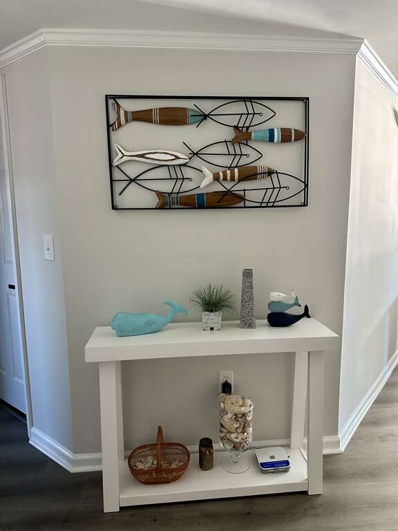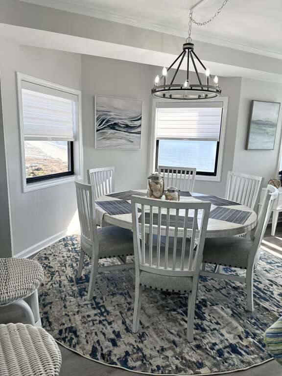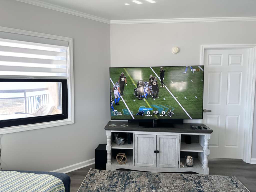 The circular dining table seats six and there are four stools at the kitchen bar for additional seating. There is a Samsung TV in each bedroom to watch the premium Spectrum Internet TV package included. Other amenities include Keurig coffee maker, blender, iron/ironing board, and an infant pack n play. The outside balcony has seating for 4 people and unobstructed panoramic views of the morning sunrise plus nearby beaches! From the back balcony there are unobstructed views of the amazing sunsets on the west end of OIB!