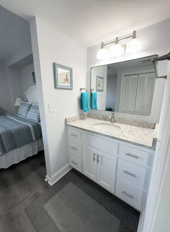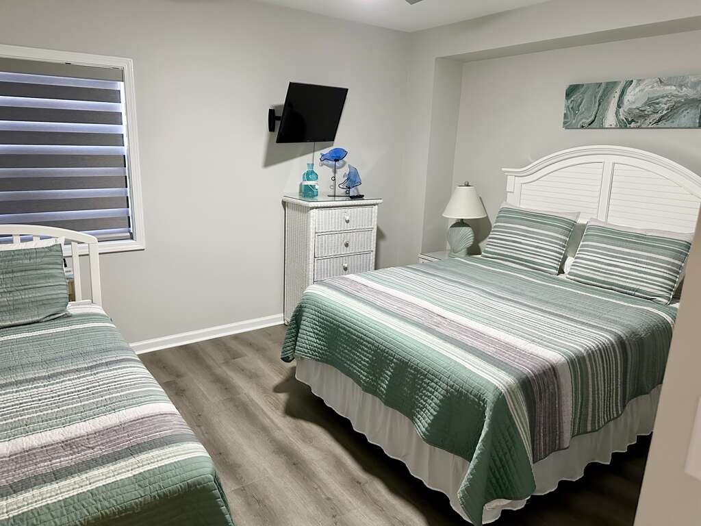 The master bedroom has has a king bed and private bath with a walk-in shower. The second bedroom has a King and a Twin . The third bedroom offers a Queen and a twin.