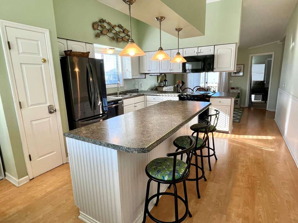 WEST LAGOONS - 22 Harbor Drive Unit 4 - OVERLOOKS THE POOL AND LAGOON - This second floor, 1200 square foot, mid-island condo, in the desirable Island Park Neighborhood, features three bedrooms and two baths on one level. Two of the bedrooms have a queen bed, the third bedroom has two doubles. The dining table seats six and there are five stools at the kitchen bar for additional seating.