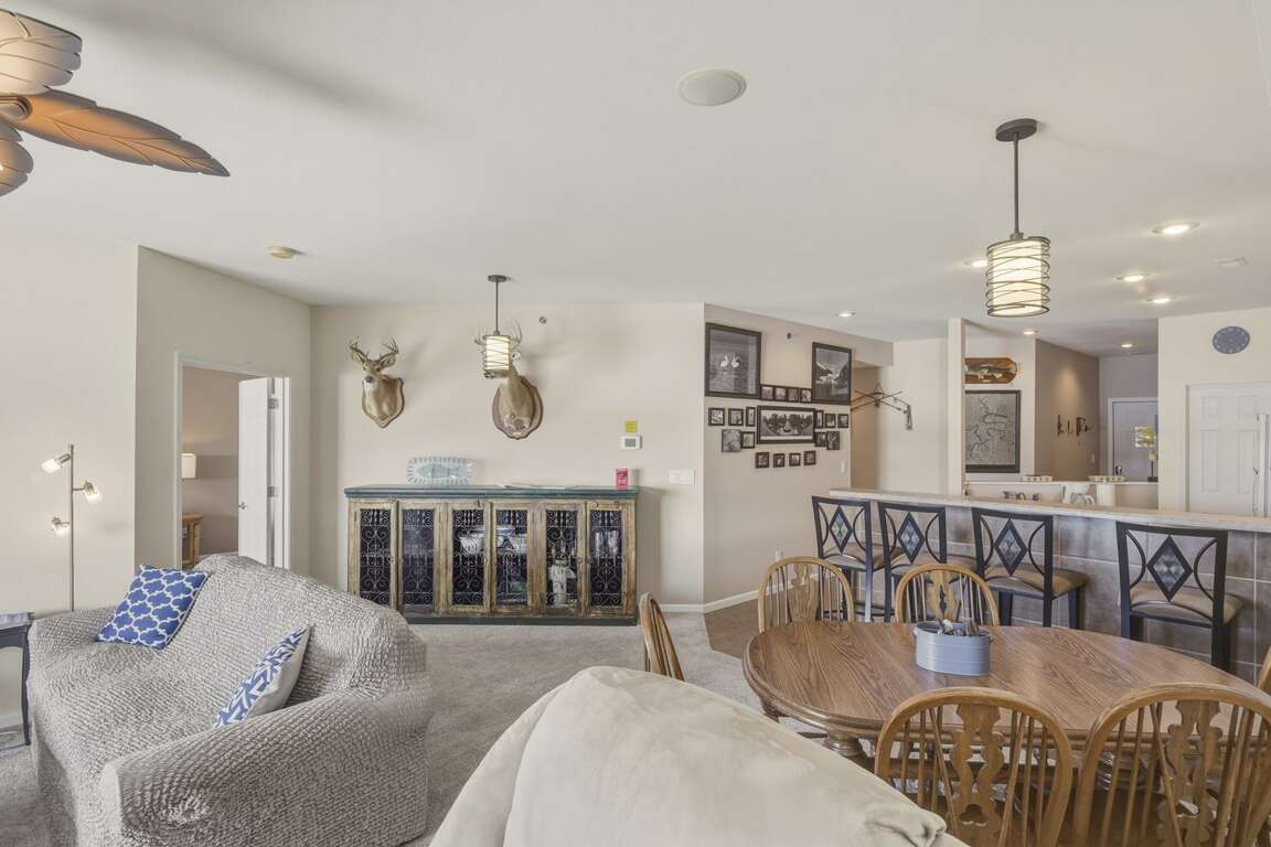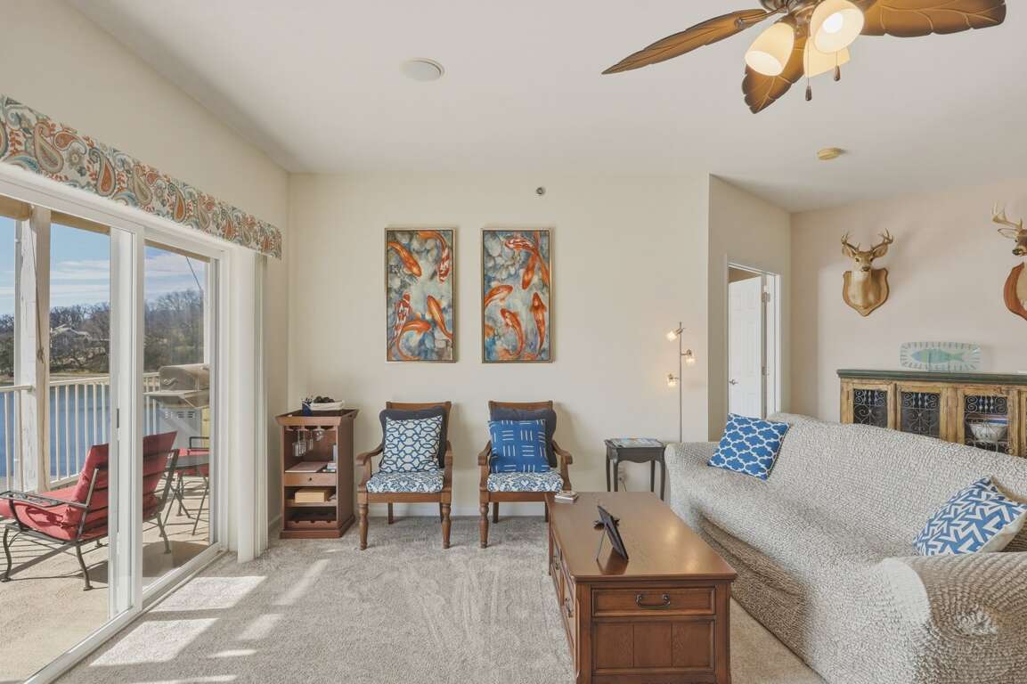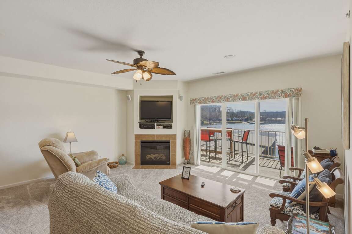 The open-concept living area features an electric fireplace large dining table, and tasteful decor that includes taxidermy, creating an inviting lodge-like atmosphere. With stunning waterfront views and comfortable, well-appointed spaces throughout, this Sierra Bay condo offers the ideal setting for your next Lake of the Ozarks retreat.