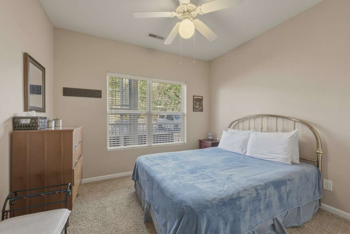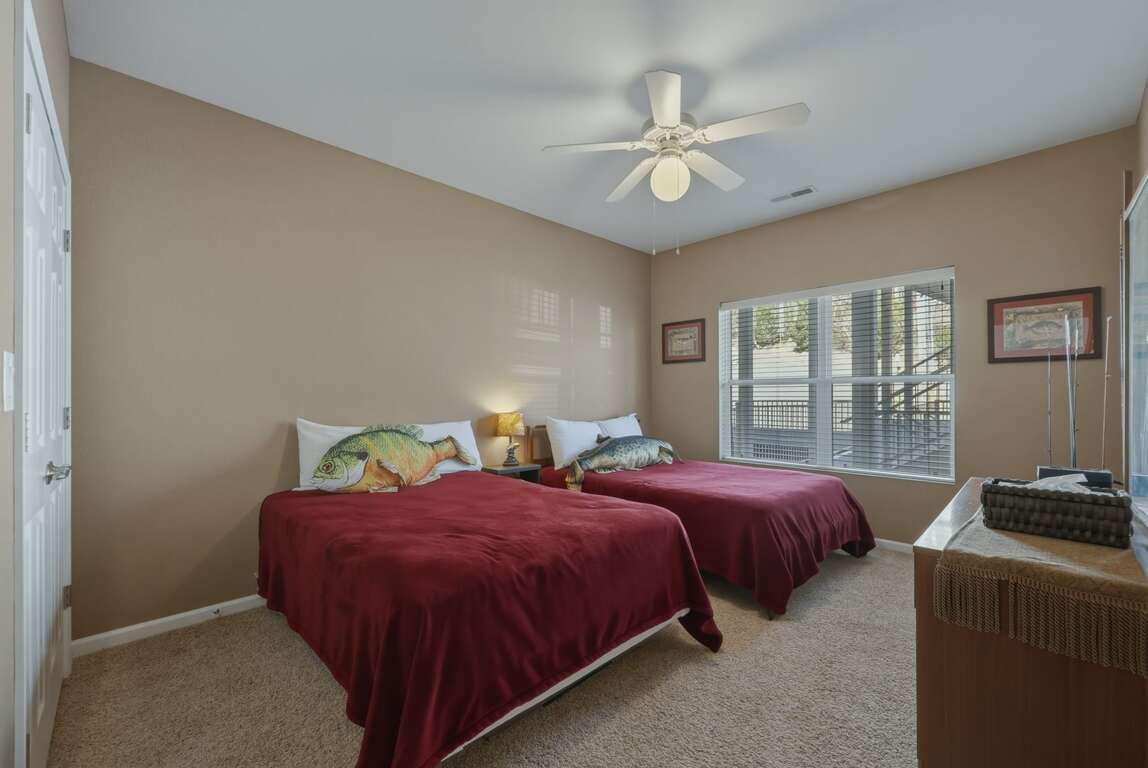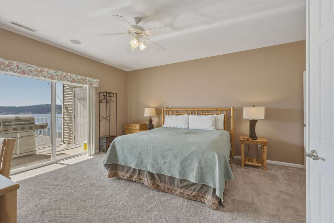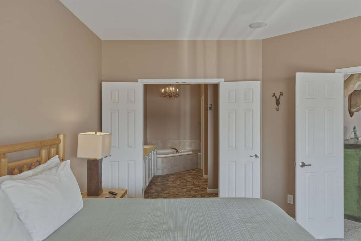 It's perfect for a relaxing lake getaway with a touch of rustic charm. The spacious master suite features a king bed, an en suite bathroom with a double vanity, a walk-in shower, a garden tub, and direct access to the lakeside deck. Its cozy décor ties beautifully into the condo’s warm aesthetic.